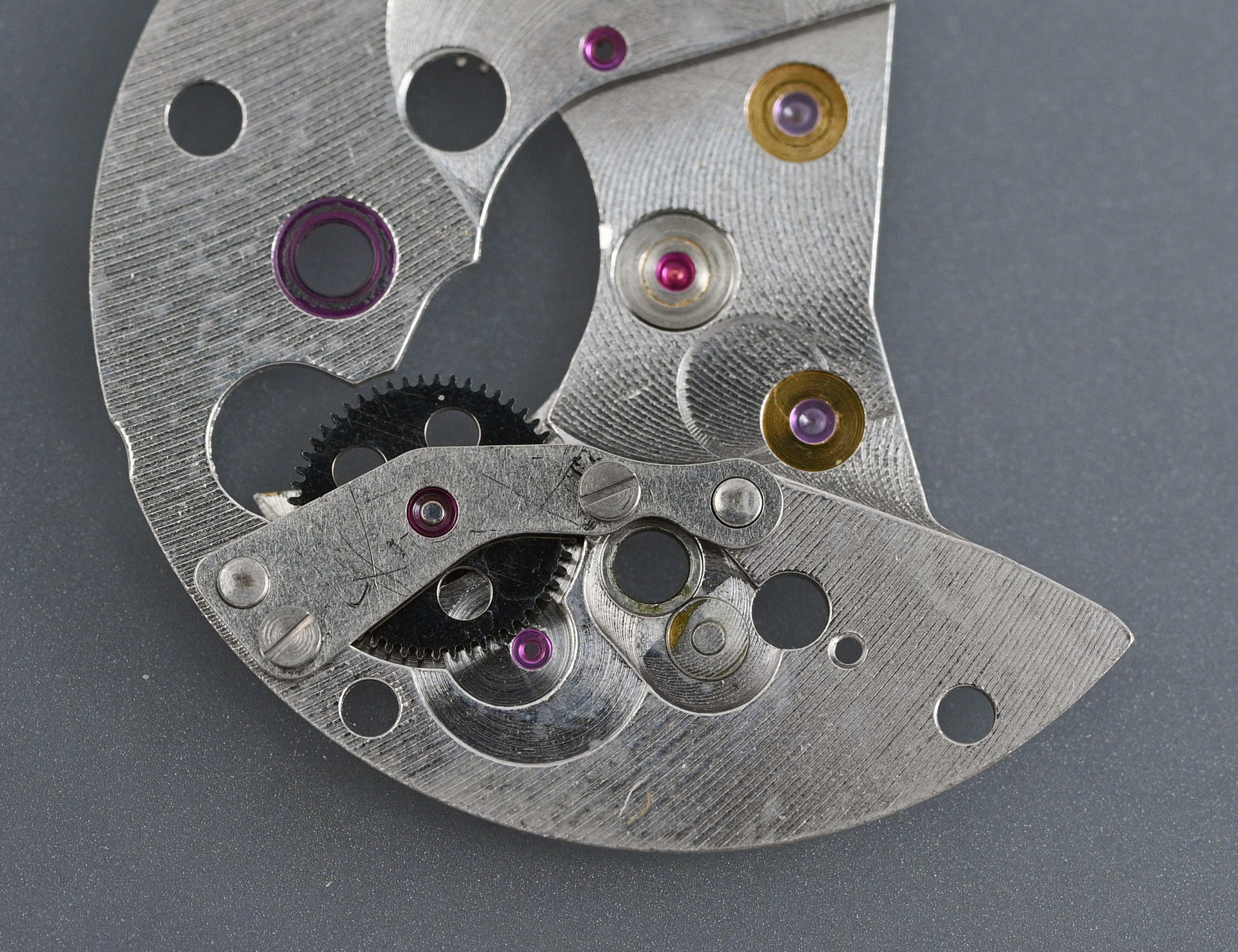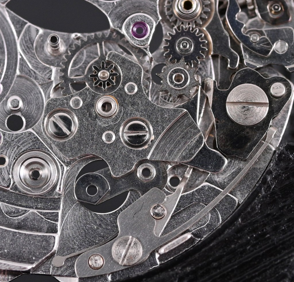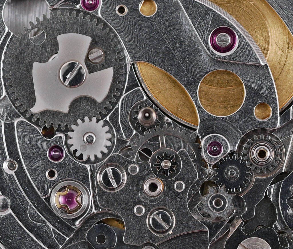 With that done, we can turn our attention to the gear train. This includes not just the usual suspects (the barrel, third wheel, escape wheel and sweep second wheel and pinion) but also the large driving wheel, which incorporates the cannon pinion (another potential weak point of this movement), and the differential wheel and second reverser idler, both part of the autowinding mechanism.