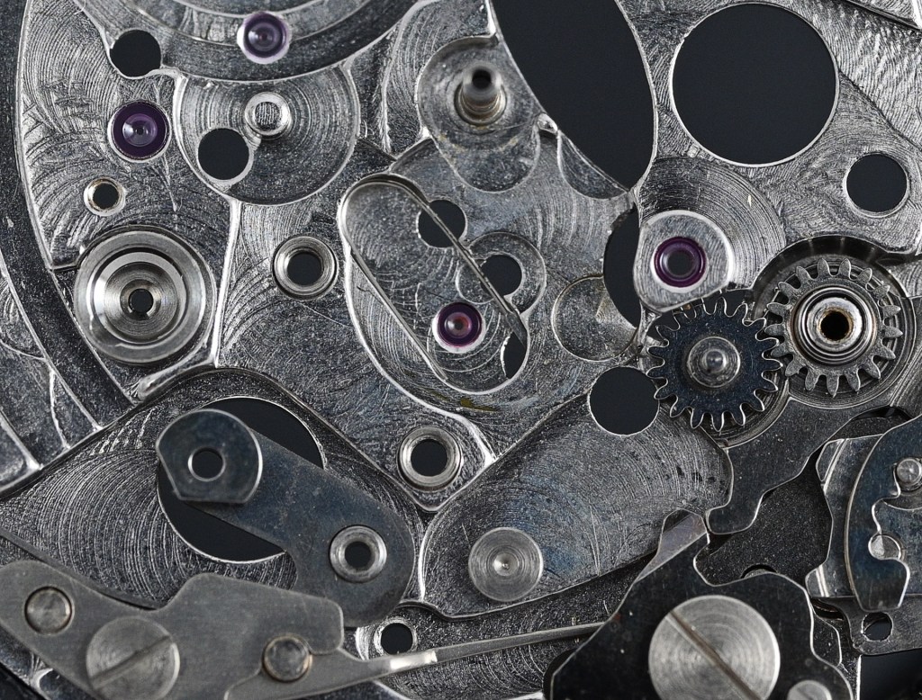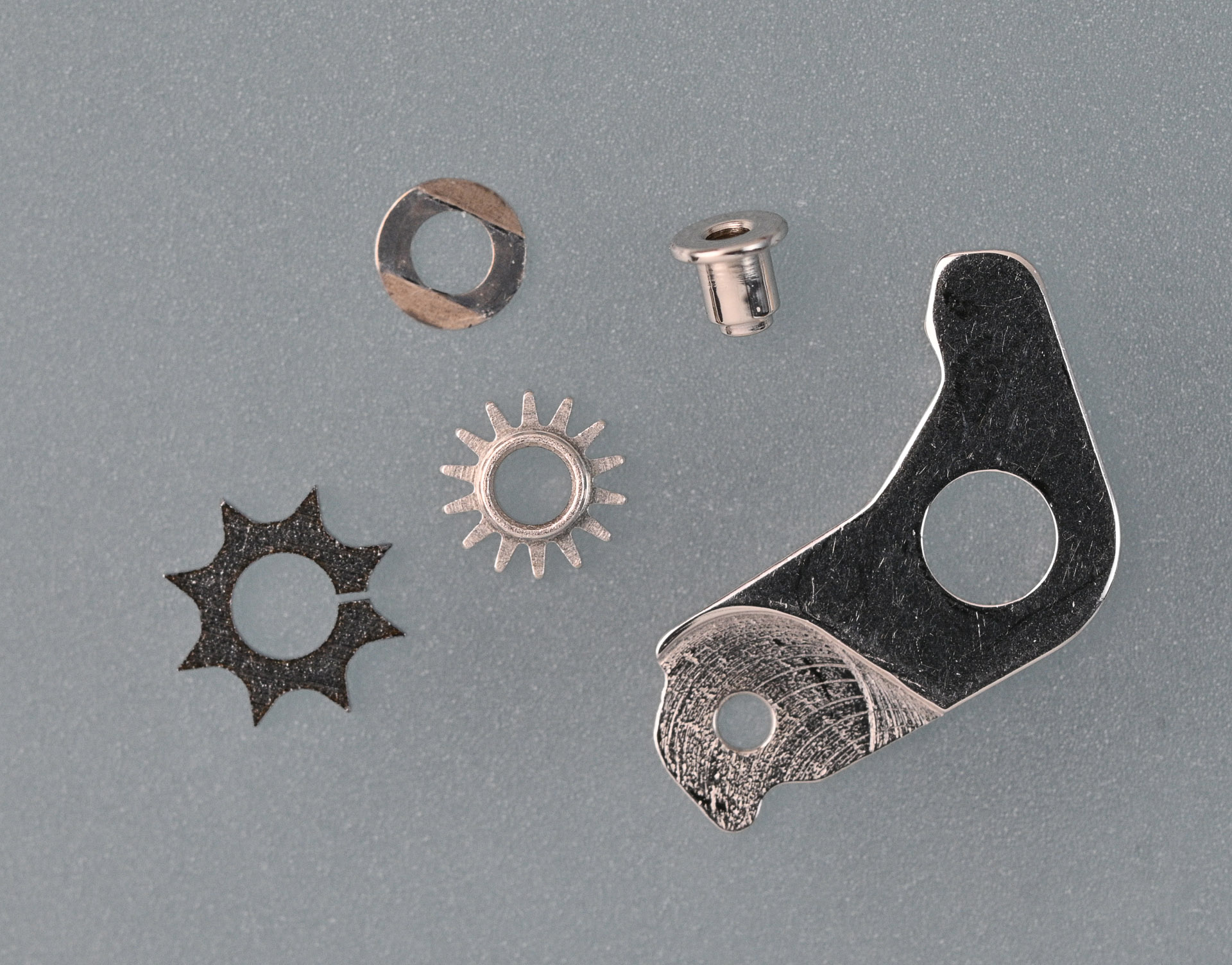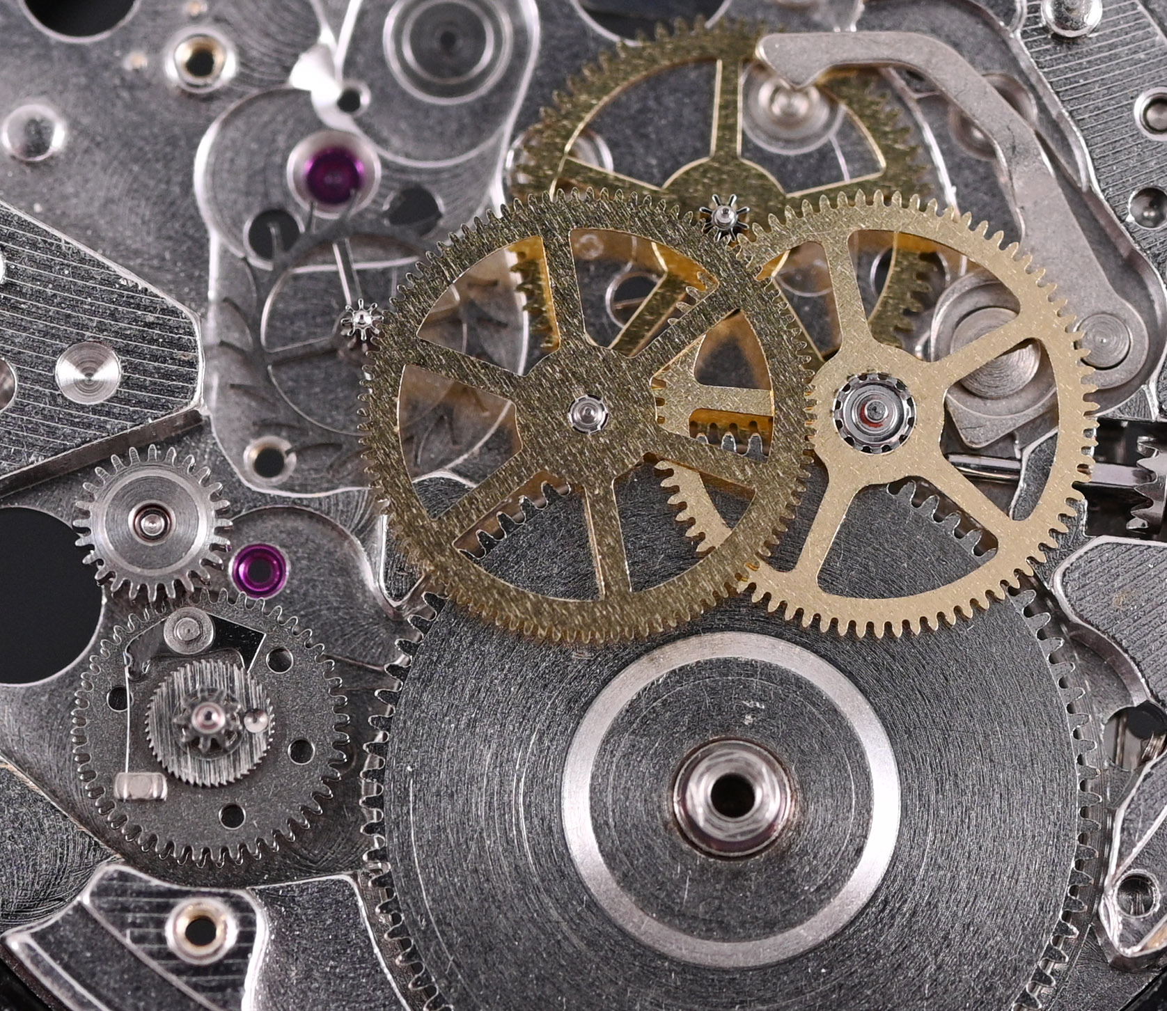With that done, we can turn our attention to the gear train. This includes not just the usual suspects (the barrel, third wheel, escape wheel and sweep second wheel and pinion) but also the large driving wheel, which incorporates the cannon pinion (another potential weak point of this movement), and the differential wheel and second reverser idler, both part of the autowinding mechanism.