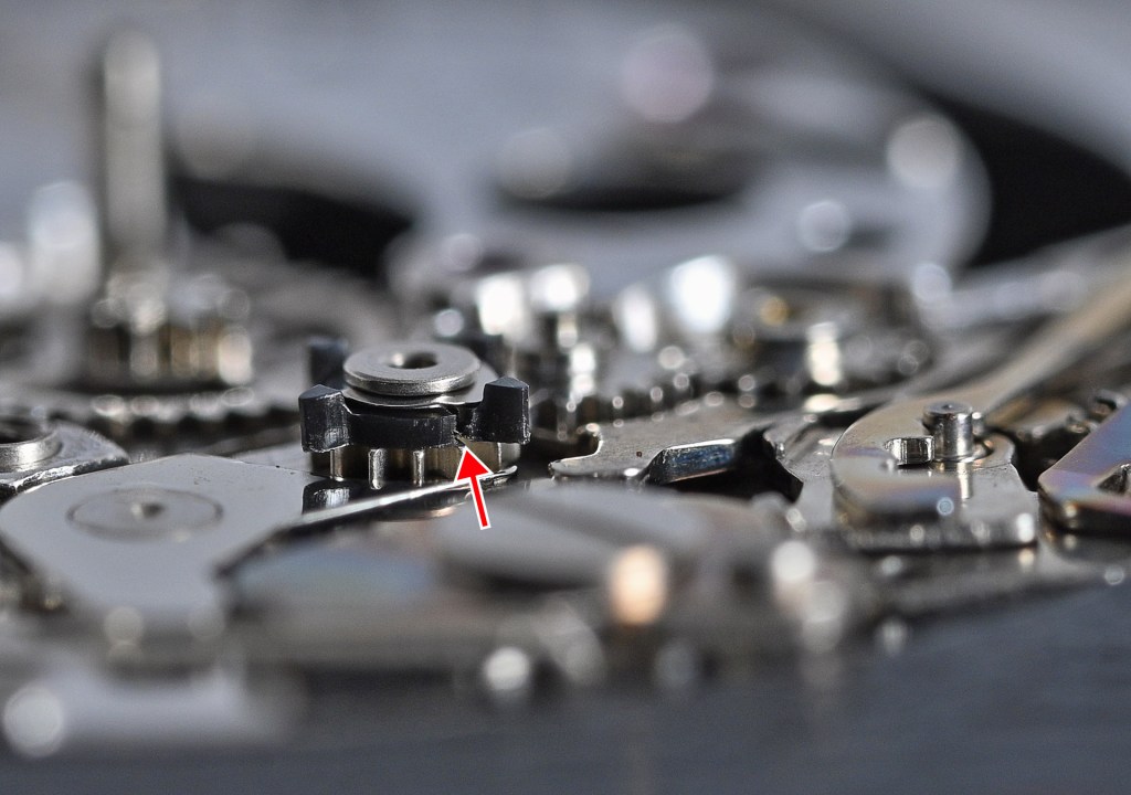 Secondly, a close-up of the day-date corrector wheel rocker reveals the extent of the injury inflicted upon it and may provide some insight into why it is now incapable of performing its intended original function.