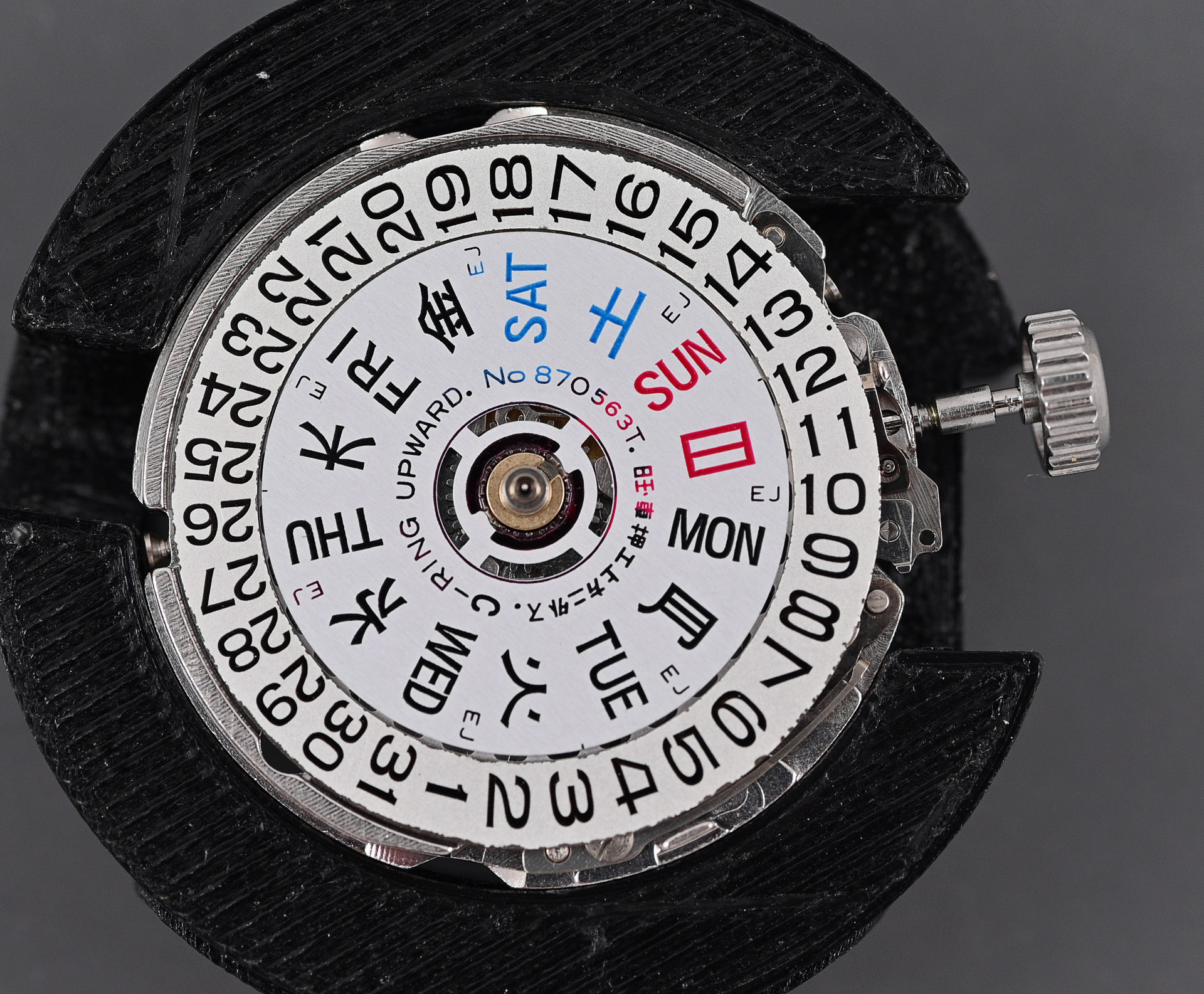 The deconstruction of the movement begins with the calendar components. I note in passing the dual language English/Kanji day wheel as well as the slightly corroded edge to the date disk. But otherwise, everything is straightforward and familiar.