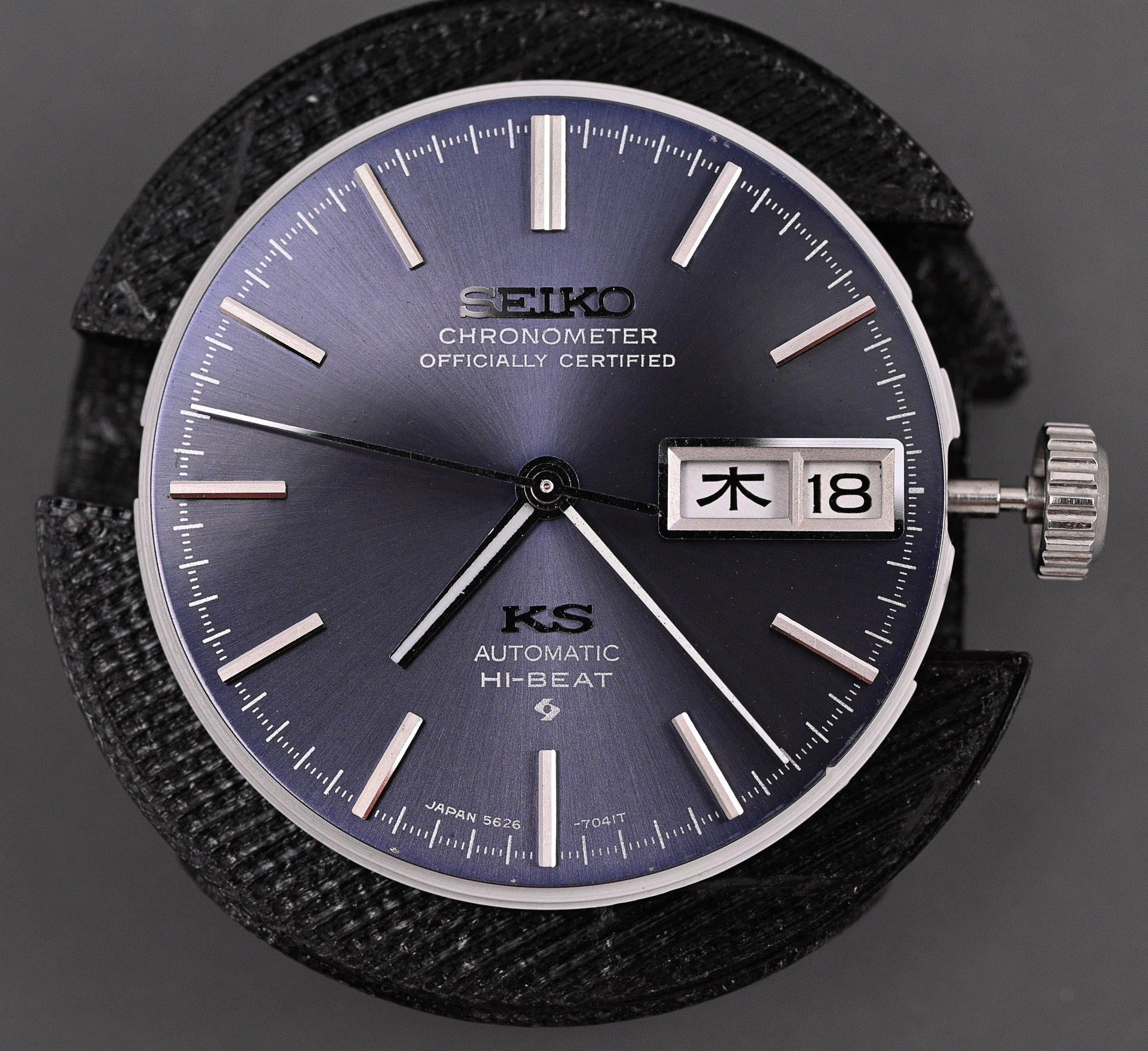 The stainless steel 5626-7040 and 7041 were available in three dial colours, one silver, one grey/blue and one green, although the green option only appeared for a short period in 1973 (in 7040 form). The blue-dialed variant was available continuously from 1970 to 1975 when the King Seiko (and Grand Seiko) brands were retired, and it is an example of this model that forms the basis of the current entry.
