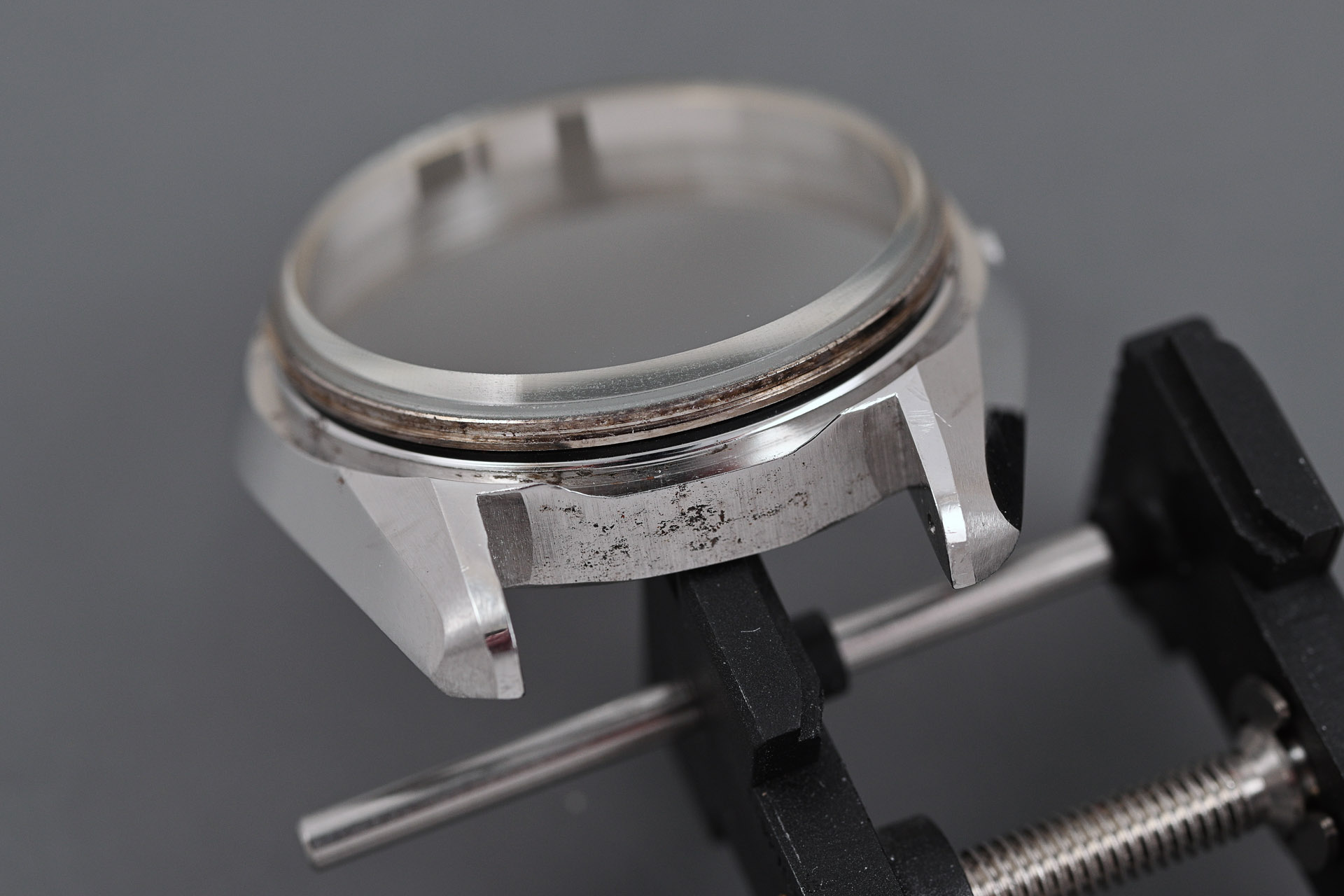 With the movement parts arranged into baskets and dispatched to the cleaning machine, I turned my attention to the case. The bezel serves as the crystal retaining ring but also as an impediment to egress of any moisture that finds its way into the moat surrounding the crystal. It is not unusual therefore to encounter corrosion once the bezel is levered away.