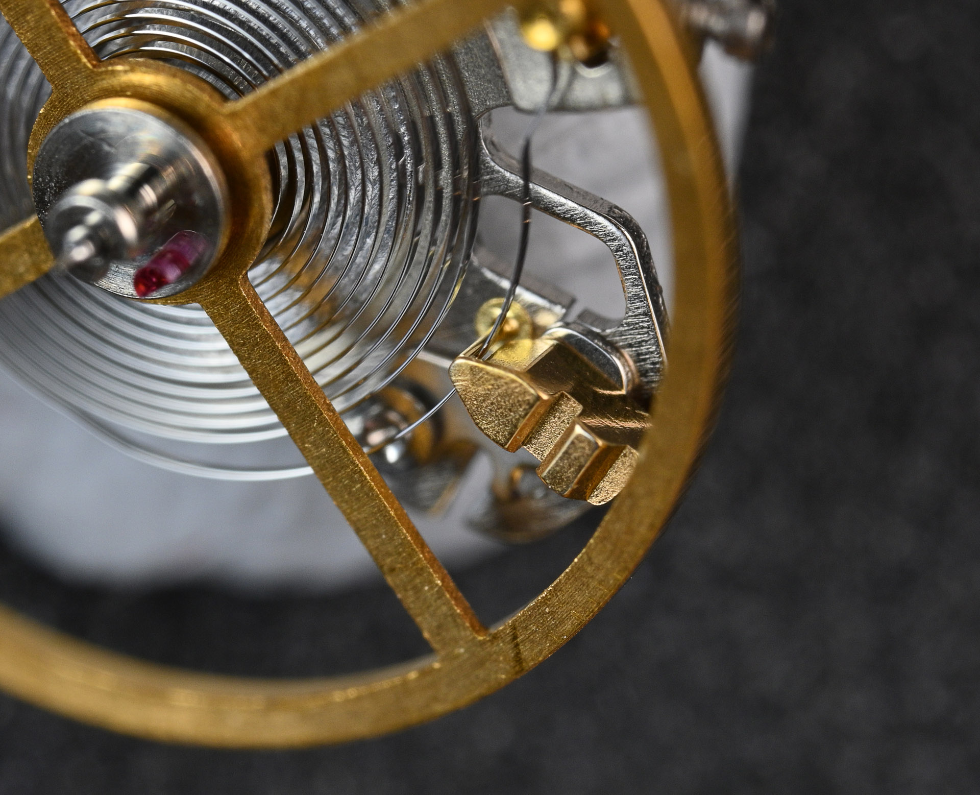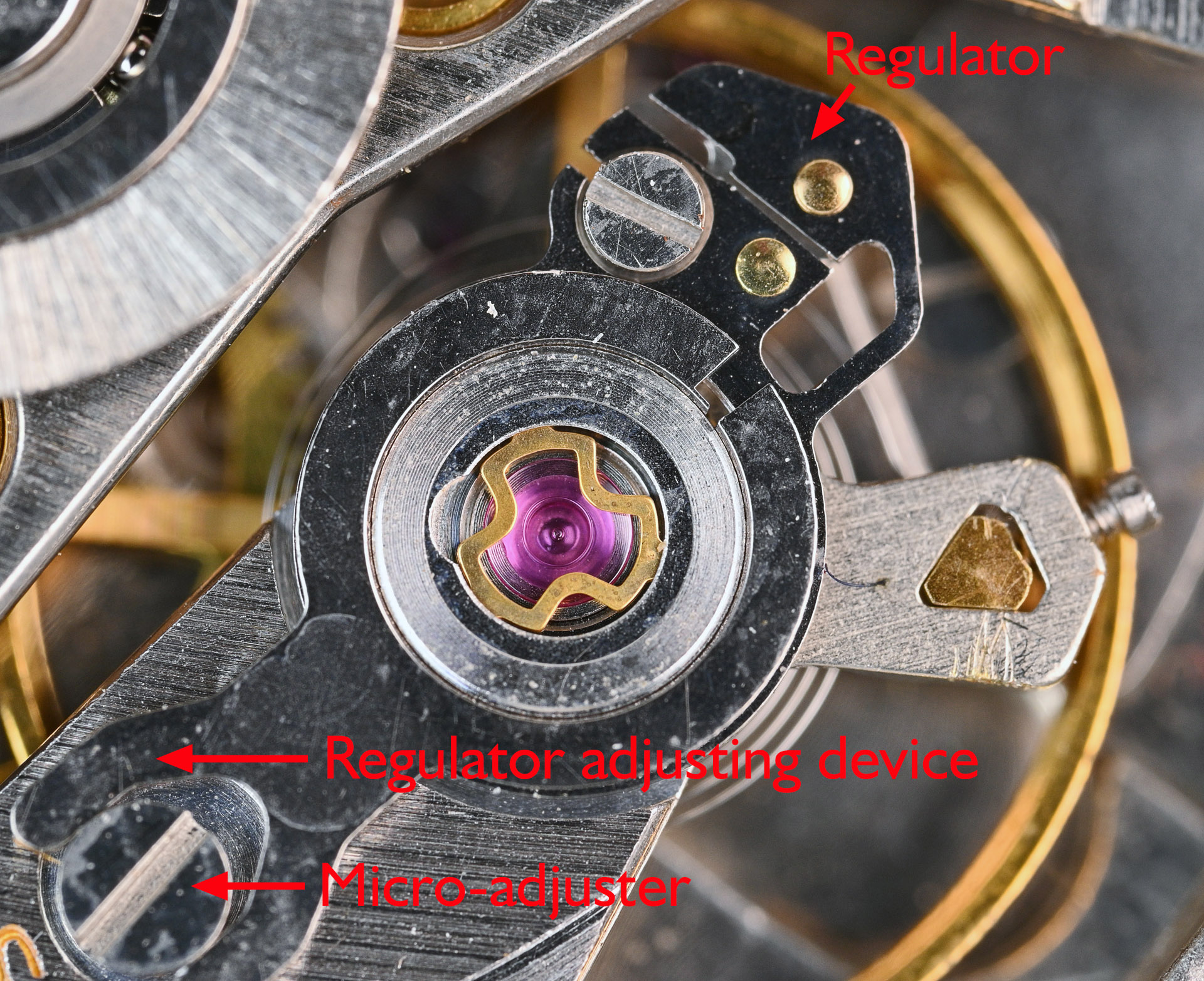 You may have noticed that the regulator on the balance has a rather complicated looking design. In contrast to the regulator on the 5626A, which features a micro-adjuster, the 5626B variant employs a different regulator that includes a second adjustment screw.
