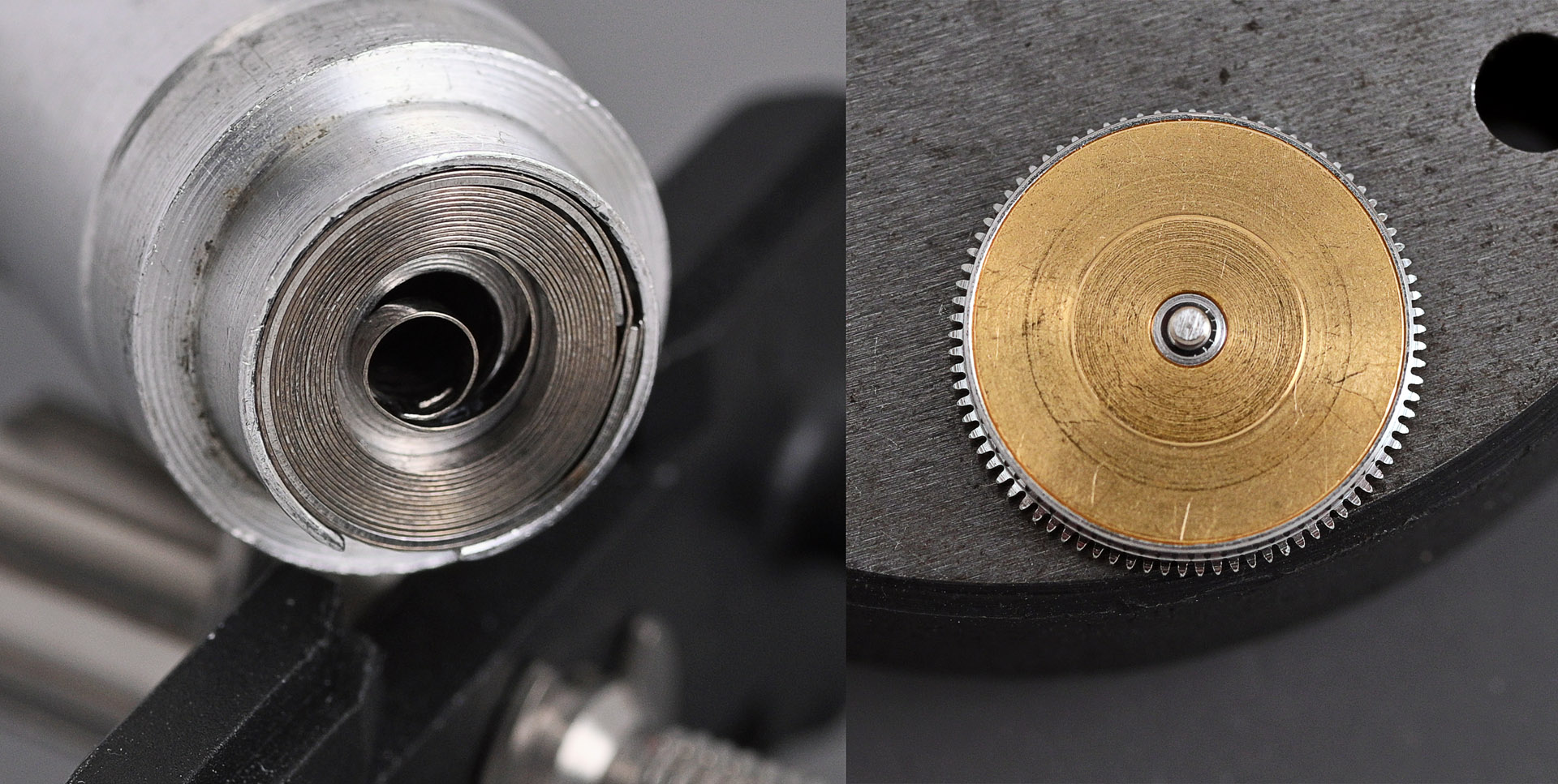 The original winding rotor, in spite of its very nice cosmetic condition, was unusable because of the worn-out bearing. It was dragging and consequently not able to generate a full wind as the torque required increases as the state of wind increases. And that’s taking no account of the wear that it would have been inflicting on the train wheel bridge. I decided therefore to substitute it for a rotor in poorer cosmetic condition but whose central bearing was in excellent shape.