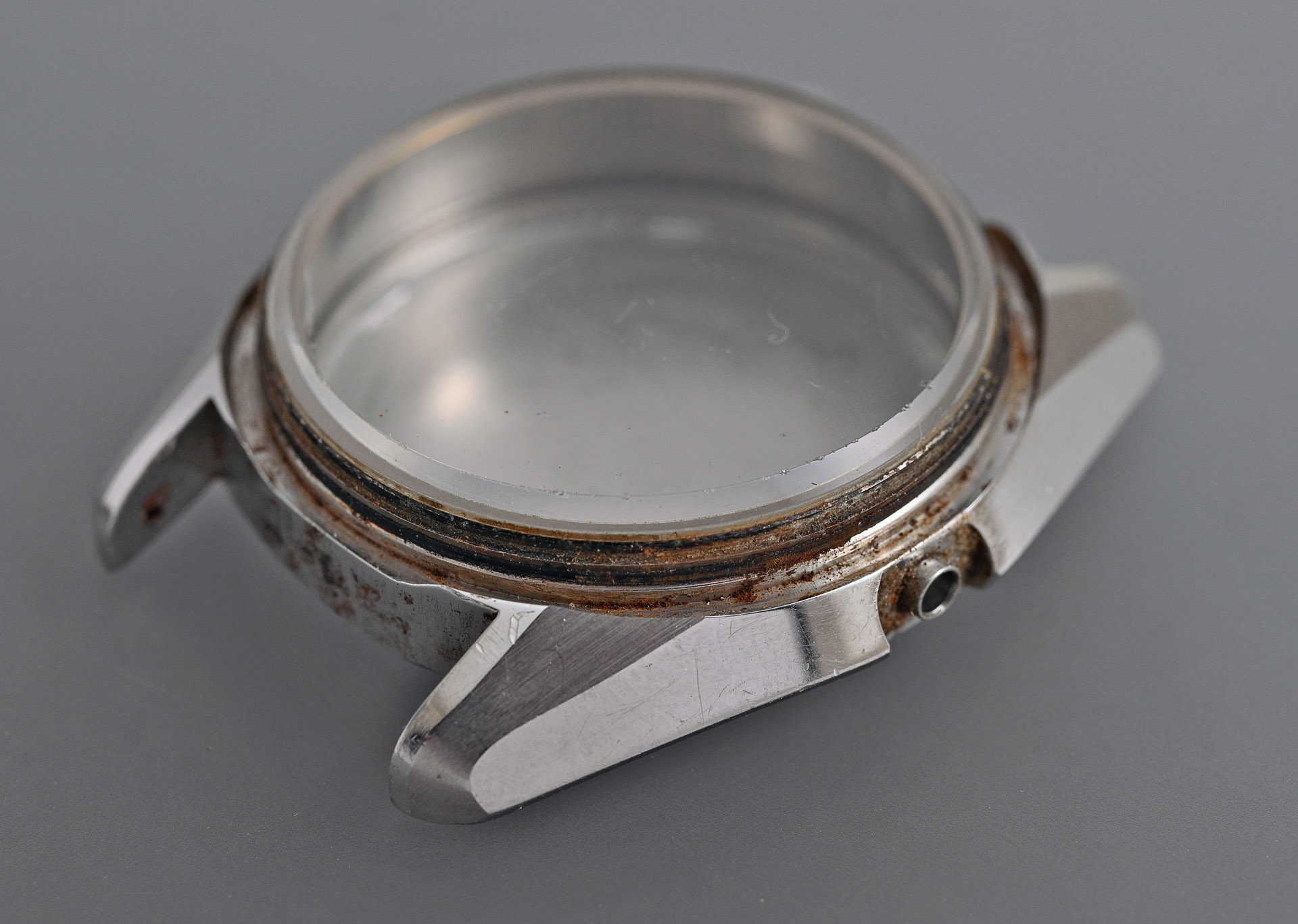 Quite a bit of the unpleasantness you can see in the photo above is just good old-fashioned grime but there is also a fair amount of surface corrosion. The V-type crystal fitted to this watch comprises a 30 mm tempered mineral glass flat Hardlex crystal bonded to a metal frame. The water resistance of the case is provided by an L-shaped rubber gasket that sits between the metal frame and the aperture in the case.