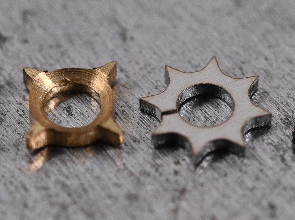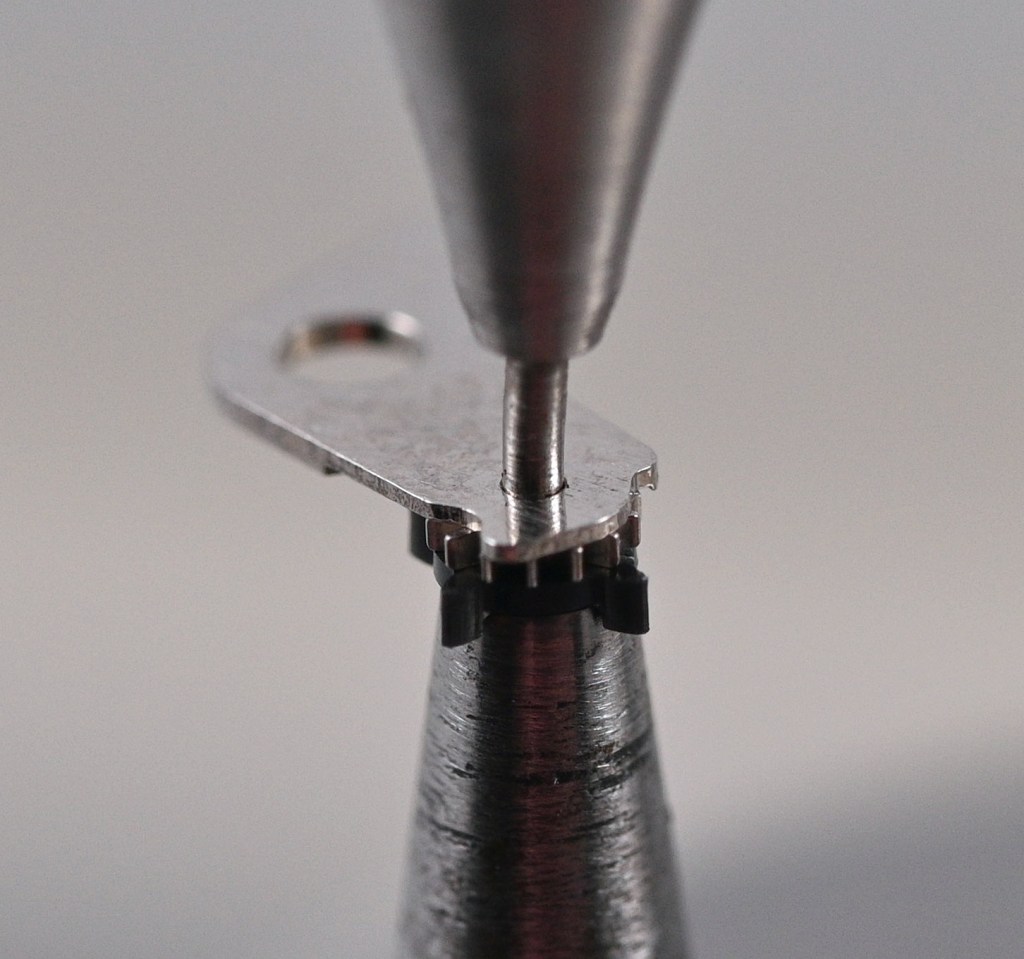 The washer you see here is a spare sourced from another broken lever in my parts drawers but extracted using a larger diameter stake as base. The order of assembly when using this design of star is different to that employed in the original construction: the star and gear are pressed together first (top left, below); the washer is placed over the hole in the lever (top right); followed by the gear and star (bottom right); and the pin placed loosely into position (bottom left, below).