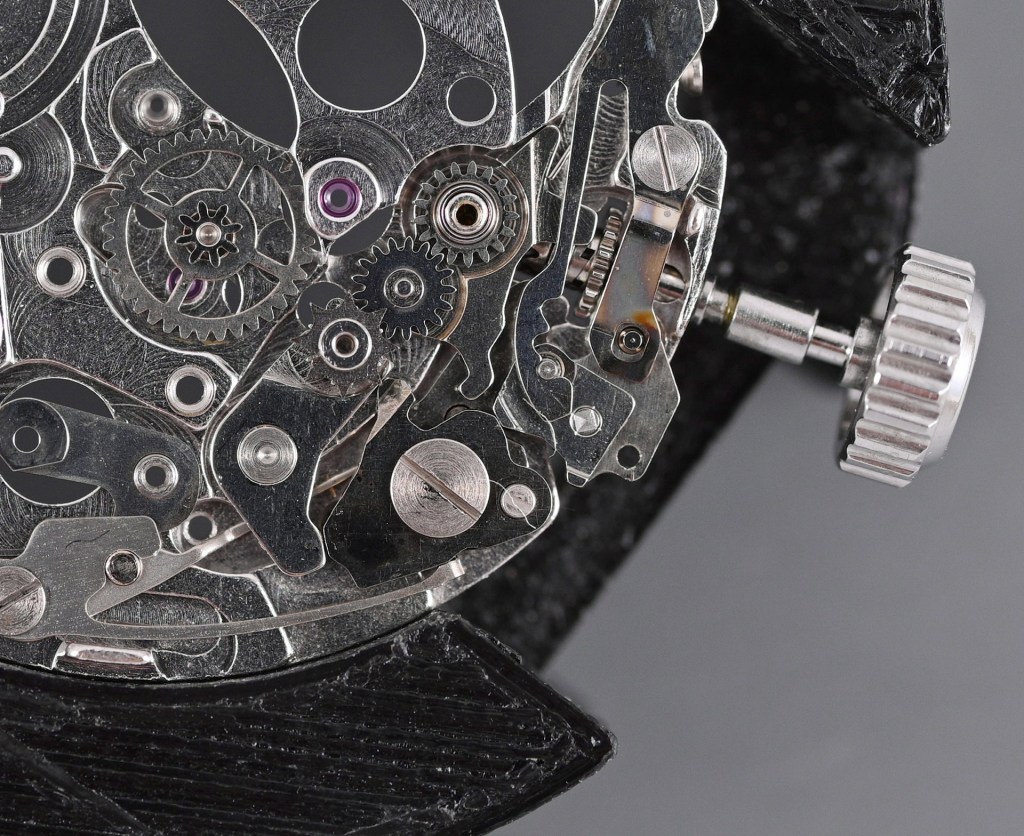 The train bridge itself is festooned with jewellery and significantly, two moving parts, one, the crown wheel, a permanent attachment (off-stage, upper, below), and the other, the autowinding mechanism transmission wheel which is held in place by its own bridge.