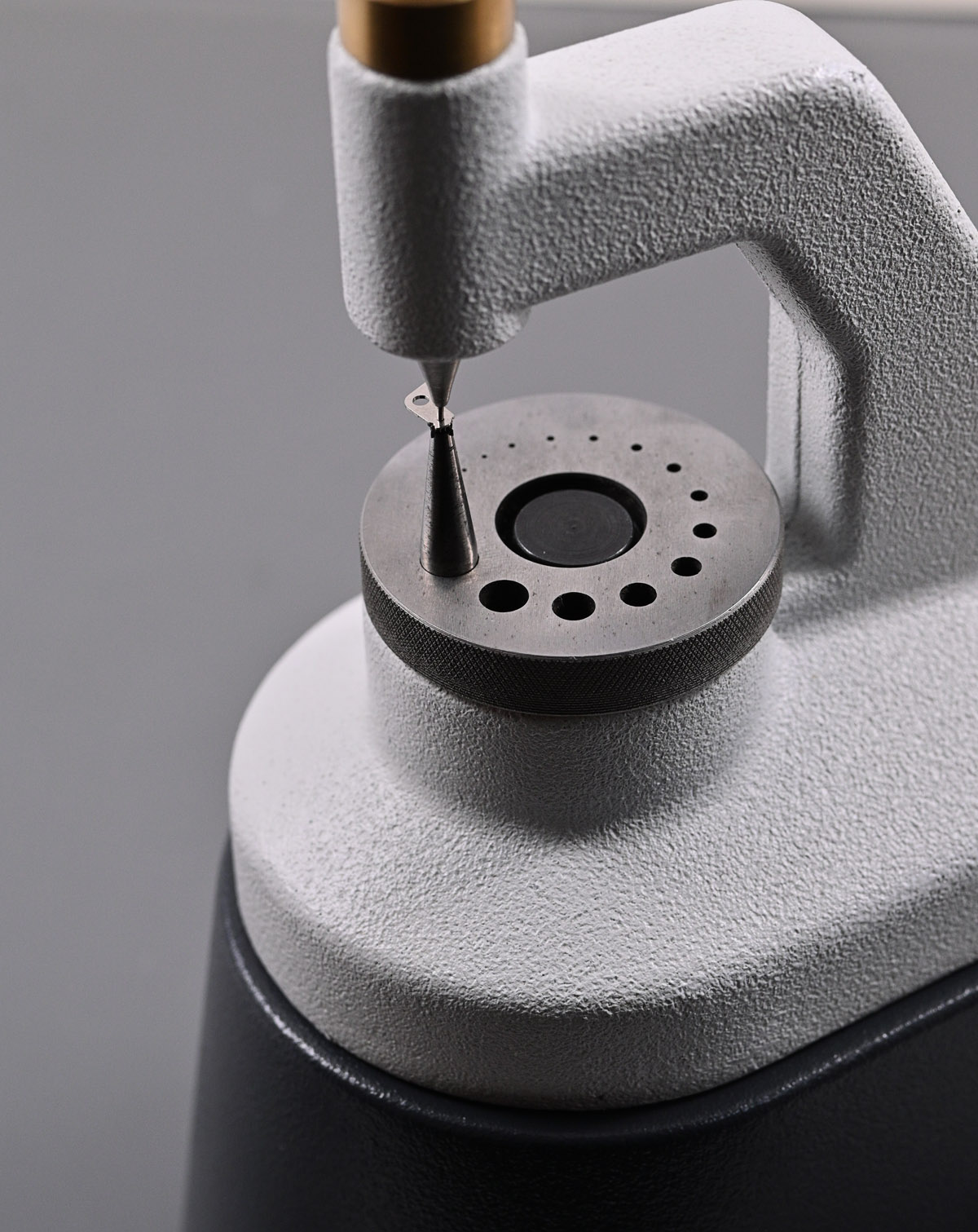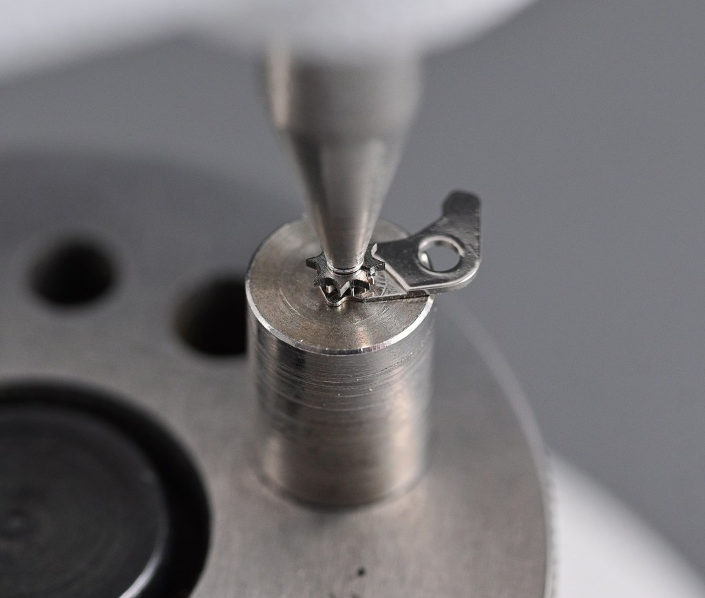 The lever is placed carefully onto a punch on the staking tool and the pin tapped back into position using an appropriately chosen stake.