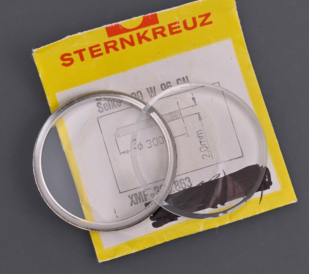 Sometimes the crystal will let go quite easily after its bath, sometimes it requires some reasonably robust encouragement. This one required the latter. The original crystal part number for the 5626-7041 is 300V16GNS and the glass itself is flat, top and bottom. Some of the 300V crystals have a slight inner and outer dome but not this one. Once the crystal is detached, the next job is to remove any glue residue. This can be a time-consuming job and is achieved best by repeatedly immersing the frame in boiling water as you work your way around the circumference. It is important to remove every last remnant of the old glue because otherwise it will mar the appearance of the metal surface beneath the new crystal. Having cleaned the frame, we need to select a suitable replacement crystal. The best option in my opinion, if you want to retain the flat upper and lower surfaces, is a Sternkreuz XMF 300.863, a replacement for the Seiko 300W96GN. This is almost identical to the original.