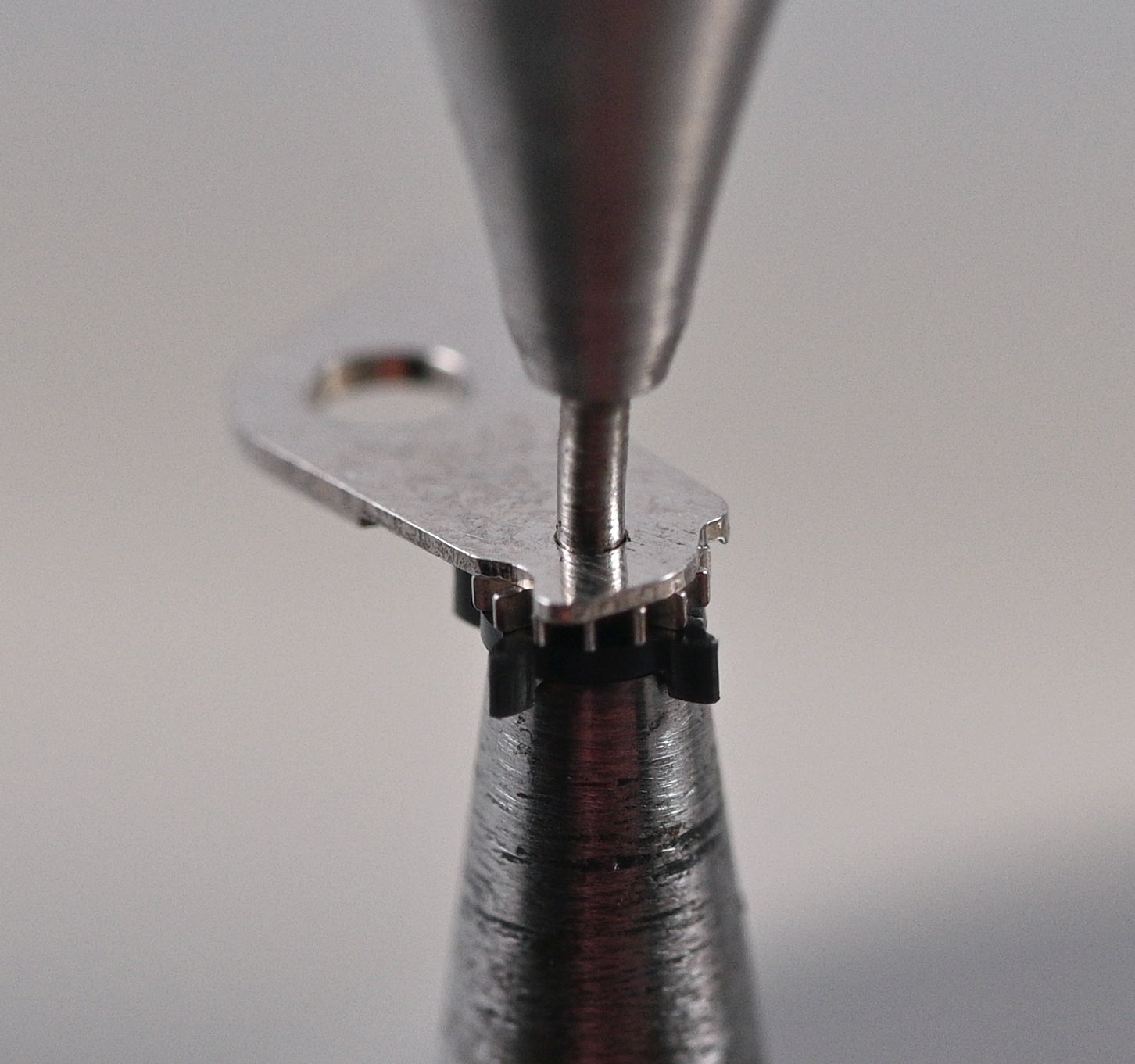 The next task is to select a suitably-sized stake to support the lever assembly while tapping out the central pin. The trick here is to choose a stake whose diameter is large enough to support the old star but not so large as to swallow the whole thing. It must also not be so small that is sits against the washer because the likelihood is that you will damage the washer during the removal process (ask me how I know).