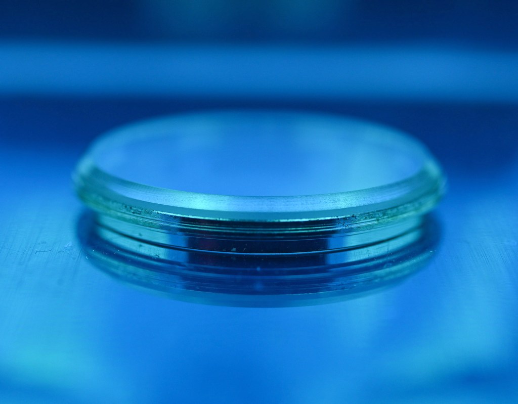 The next step is arguably the most difficult to do well: apply a thin layer of Seiko S-314 UV curable glue to the metal frame, making sure not to apply so much that any excess will squeeze out and mar the polished inner bevel when the crystal is fitted. Once you’ve applied the glue, lower the glass into place, rotating back and forth a little to smooth out any bubbles and spread the glue more evenly. Place the combined glass and frame under a UV lamp and leave for an hour or so, turning occasionally.