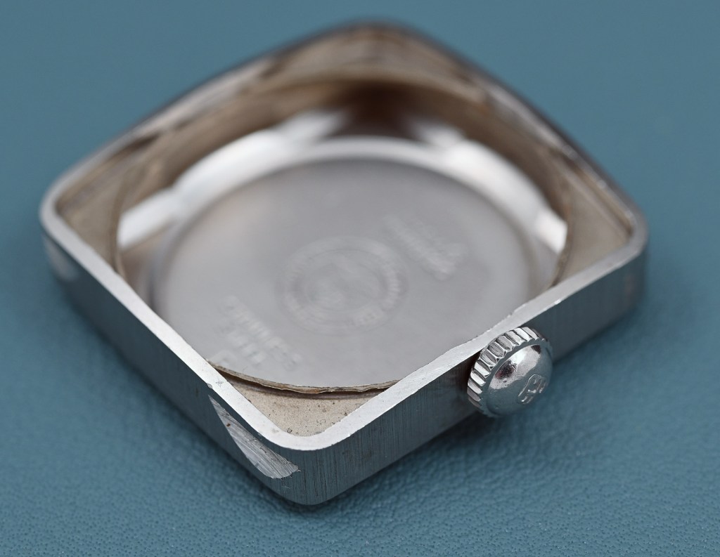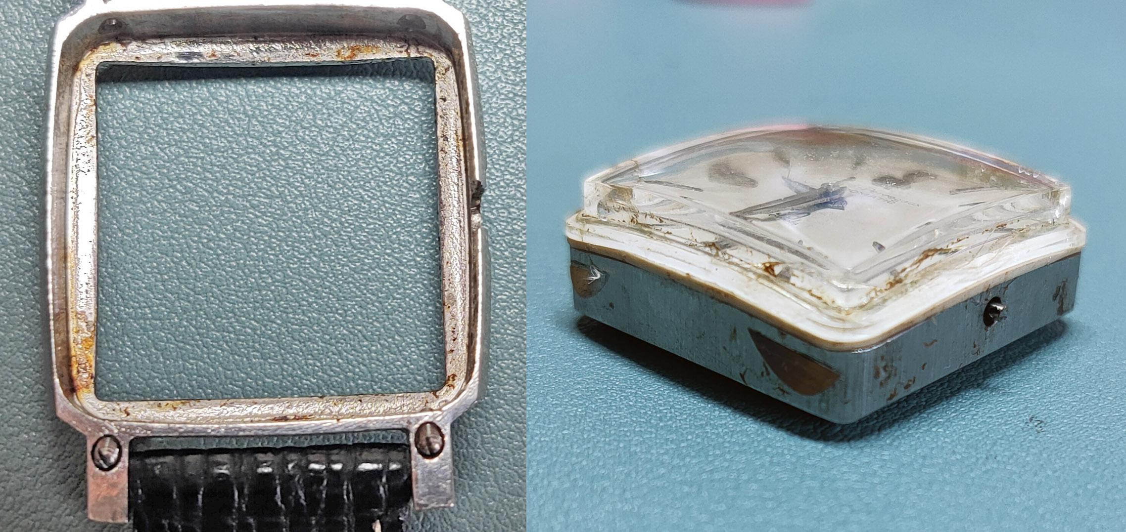 In the photo above, taken shortly after the visit from the postman, we get a clearer view of the damage to the crystal as well as a suggestion, based on the brown staining around the periphery, that water has gained access through the breaches in the crystal. With the upper mid-case removed (you may recall that this watch uses a two-part compression fit construction), we can see further signs of some minor corrosion to the underside of the case.