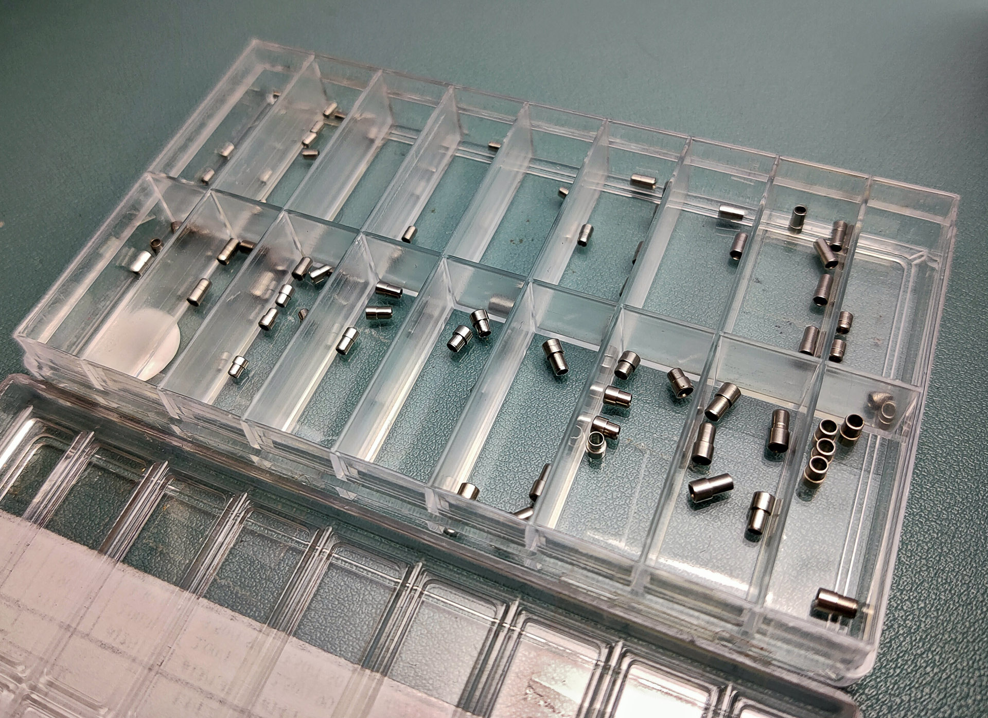 However, in order to impart a reasonable degree of water resistance to the case, I would need to confront the question of the missing crown tube. With the watch in hand, I was able to measure the hole in the case and the diameter of the hole in the crown and determined that none of the commonly available generic pendant tubes would fit the case. However, if I reamed out the hole in the case, I would be able to fit a pendant tube with a diameter of 2.5 mm at the crown and 2.0 mm at the case. In selecting the correct tube, I needed also to account for the clearance of the male/female interface of the split stem.