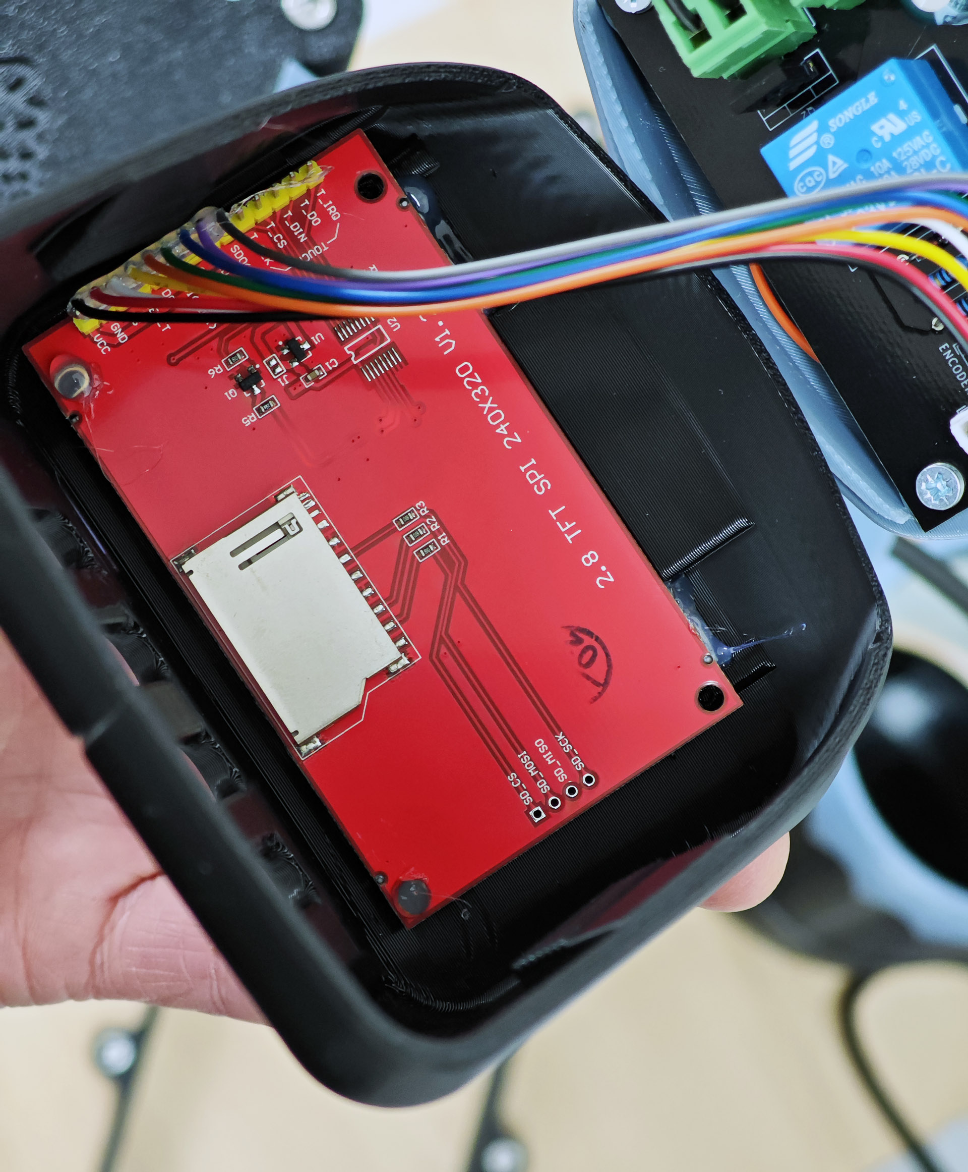 The final steps all concern the wiring of the various electrical components to the Kiwiboard controller. The first of these is to fit the encoder knob into the hole in the computer housing, securing it with a squirt of hot glue. The board itself is placed loosely into position and the wires from the power supply, heater, fan and motor trimmed to length and connected to the board. Considerable care is required in connecting the motor because of the changes in wire colour between those on the motor loom, those in my chosen extension lead and the colours given in the manual! The encoder knob is connected to the rear of the board and the screen to the top.