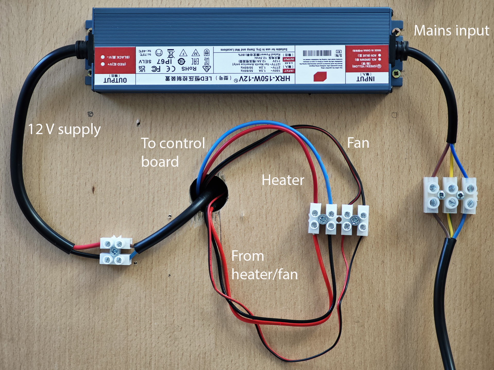 The wiring from the heater is routed through the hole in the wooden base and then connected to the extension wiring which finds its way up the 30 mm central tube to the control unit at the top. The wiring is all selected to handle more than the anticipated maximum current load. The mains input connects to the 150W 12 V power supply which is fixed to the base of the board and the 12 V output connected to a 13A-rated extension lead that feeds up the tube, also to the control board. For additional safety, I covered the connector blocks feeding the mains supply with a plastic cover.