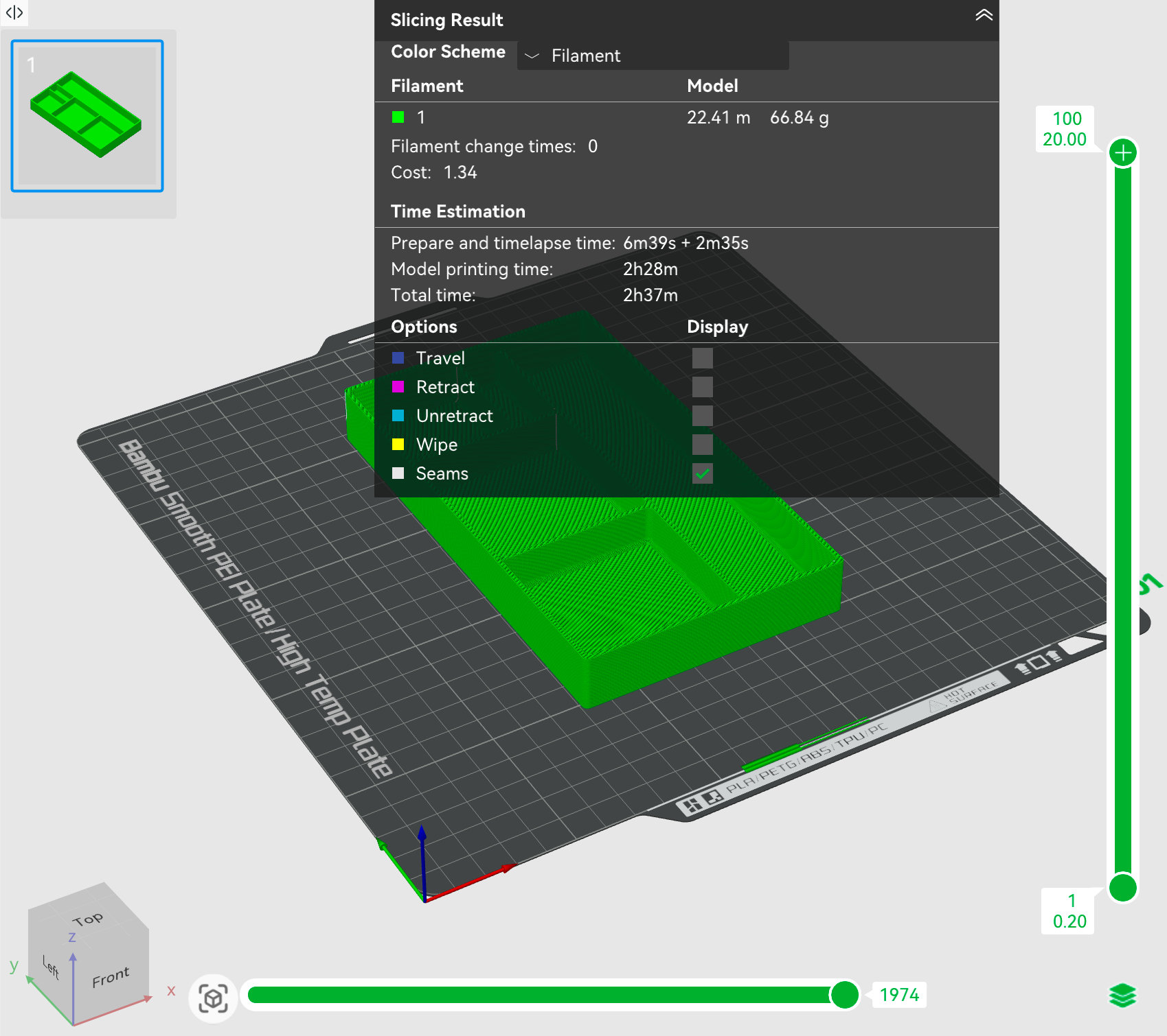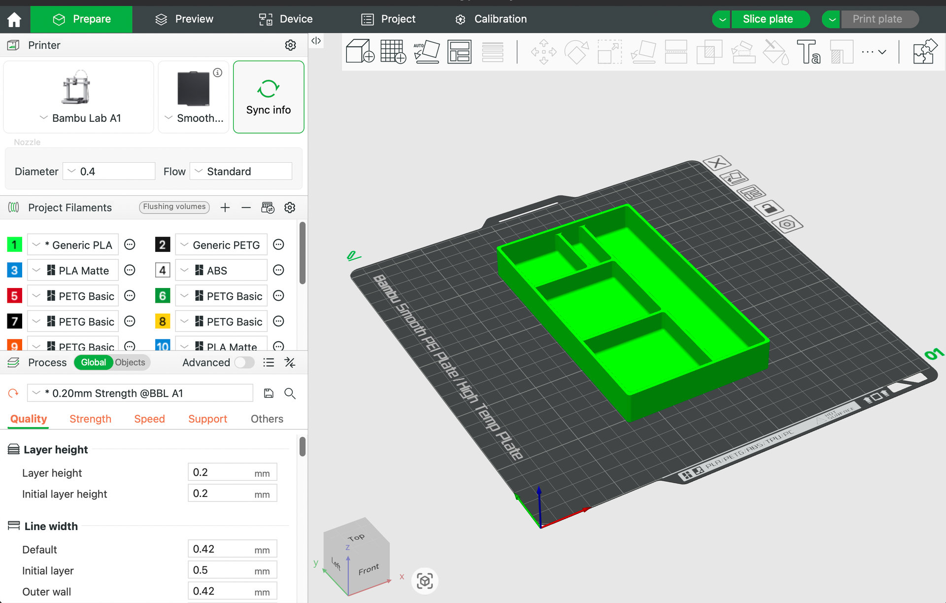 A lot of trial and error was required to get the quality of finish that I wanted and crucially that rendered the overhangs sufficiently cleanly to allow for a satisfactory fit between each tray. This involved a lot of trial and error in optimising the supports that prevent overhangs from drooping during the printing process. The supports need to provide a uniform platform that ensures a clean finish to the underside of the overhang but not so dense that removing the support afterwards presents a problem. Having imported the .stl file, adjusted the settings, and sliced the plate, we are ready to print.