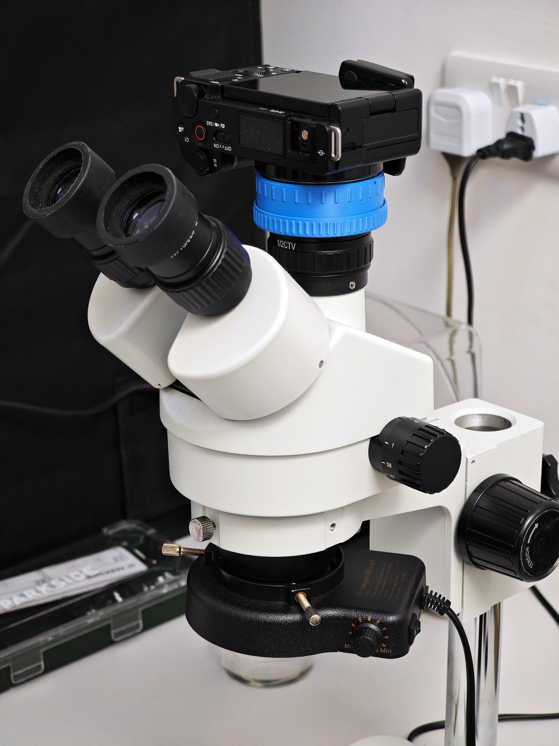 or, the adjustable mount adapter that allows me to fit my Sony mirrorless camera to the camera port of my stereo microscope.