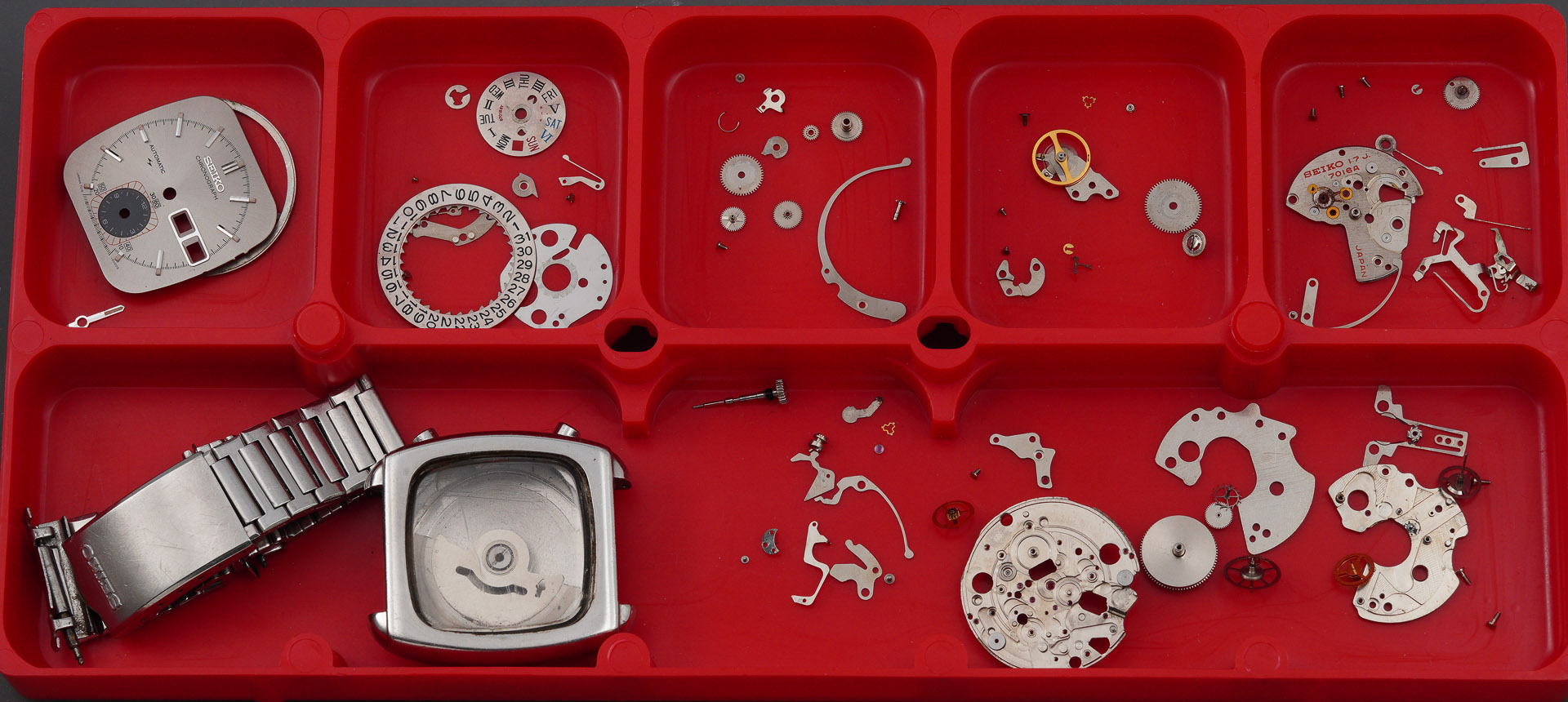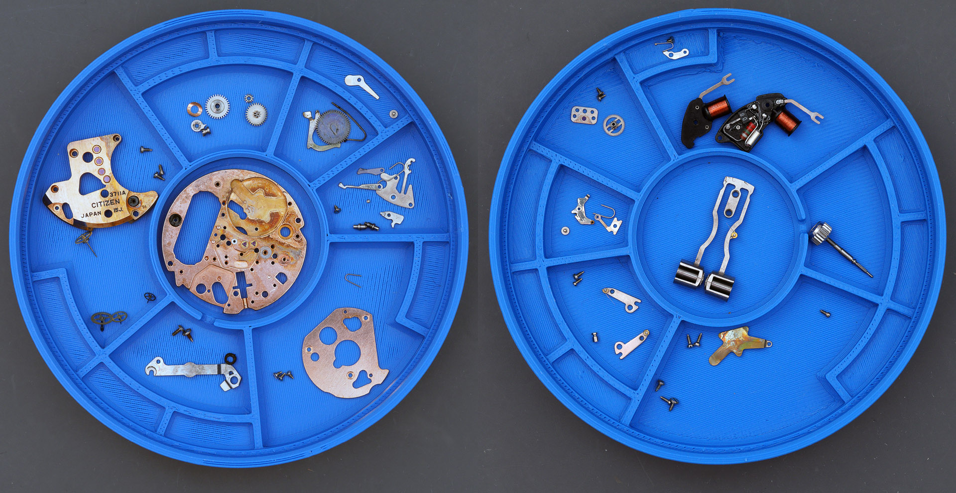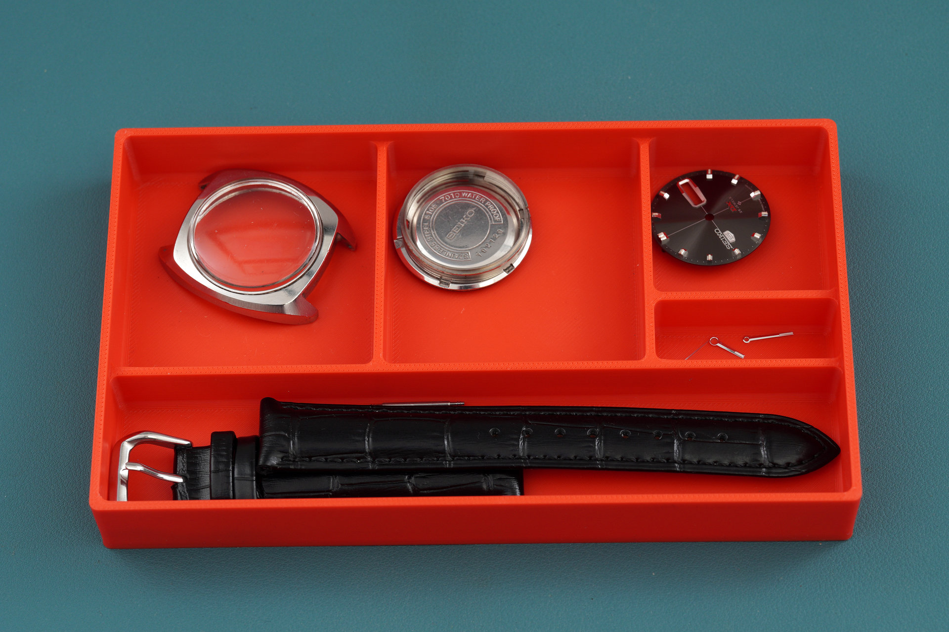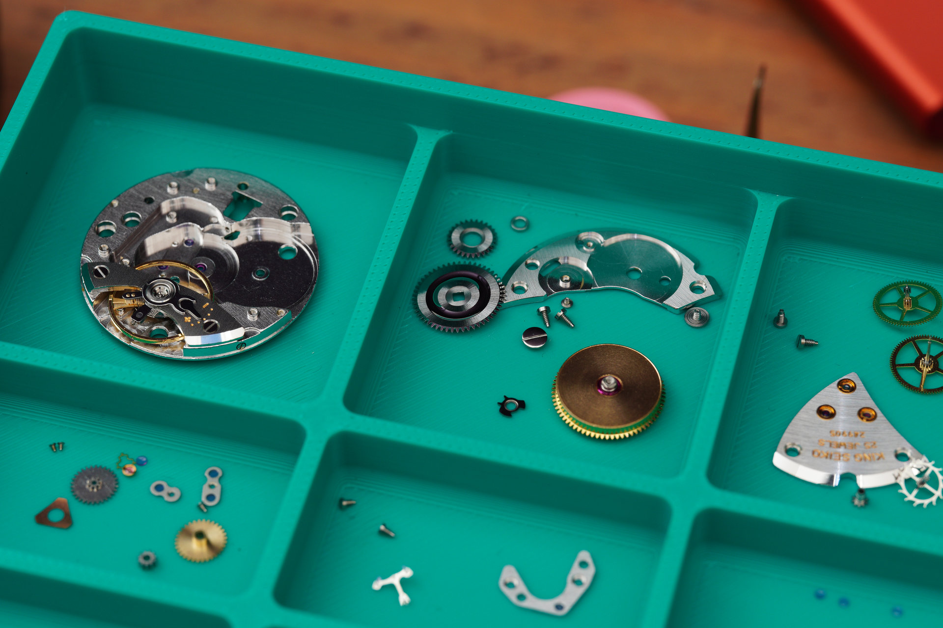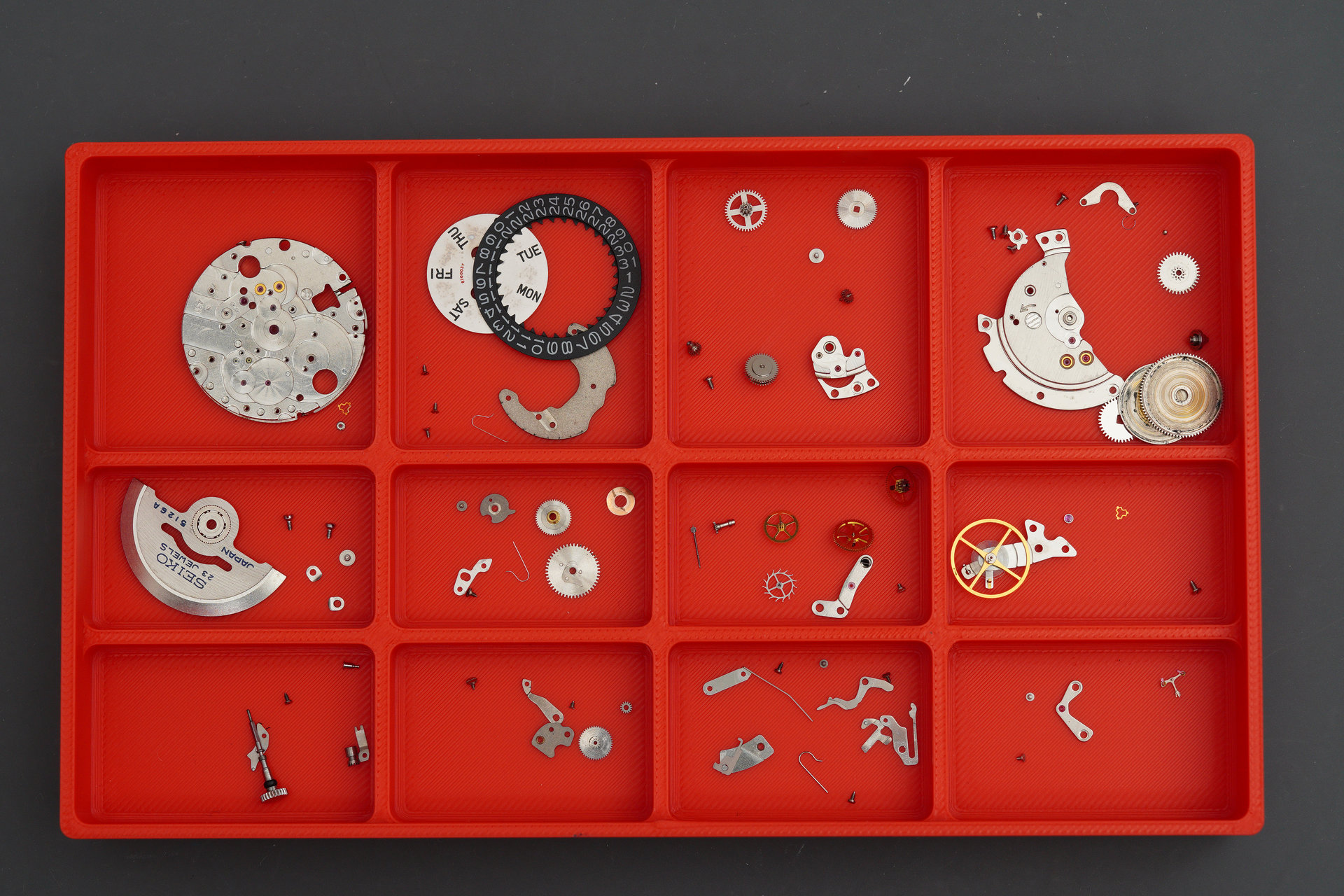 Central to every project is the need to organise, store and sort the casing and movement parts as a watch is disassembled, and to support the movement safely during disassembly and reassembly. My objective in taking matters into my own hands was to realise solutions to these requirements that better fitted my workflow and, most importantly, to make my life easier. What follows is a description of the process from conception to design to production for two projects: the first, a set of interconnecting casing and movement parts trays and the second, a set of bespoke movement holders to fit most of the common vintage Seiko movement types and sizes.