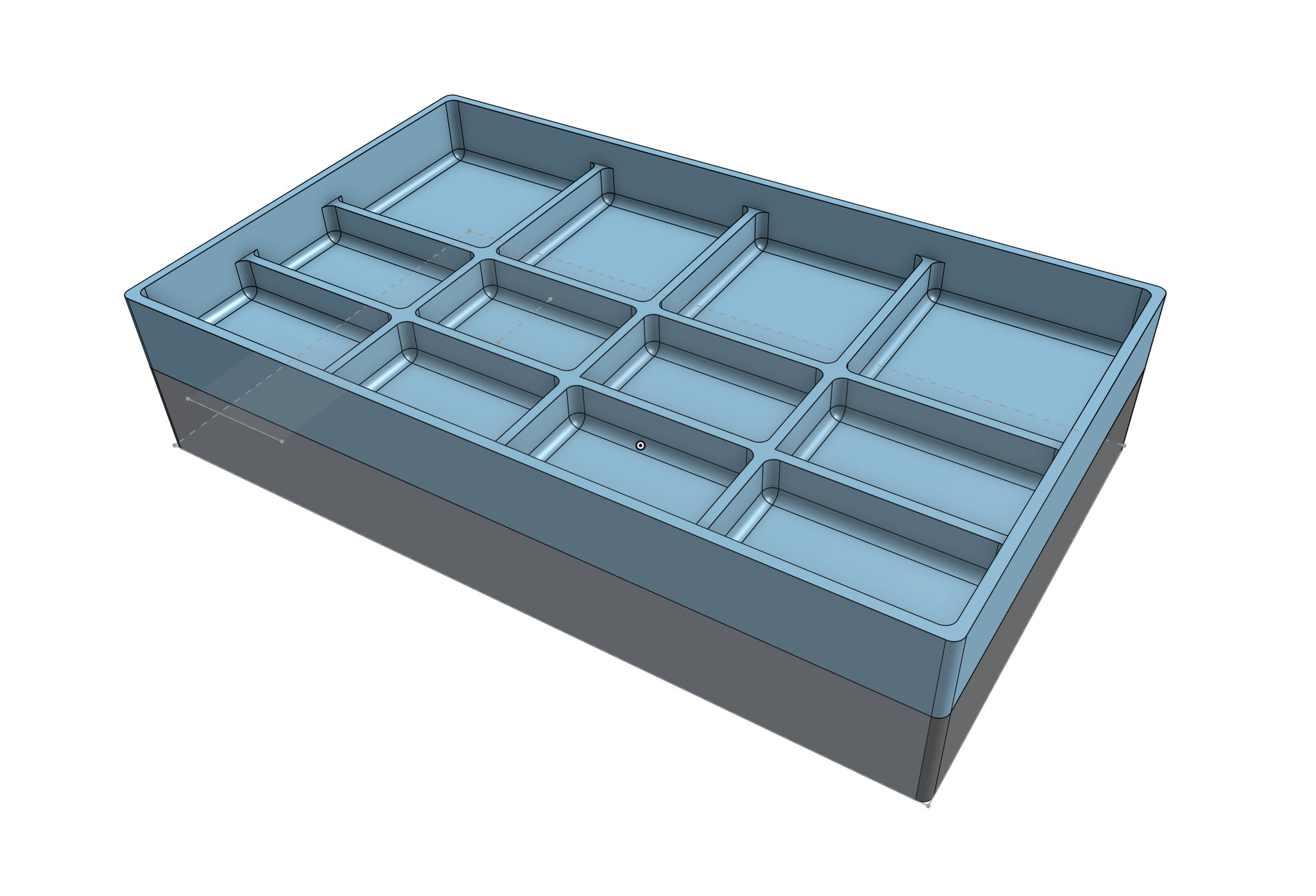I wanted something smaller with stackable trays dedicated to casing parts, mainspring, movement parts and a general-purpose lid that could also be used for miscellaneous purposes. The compartments within each layer would need to be sized to accommodate parts large and small and arranged to fit with the sequencing and organisational requirements of each project.