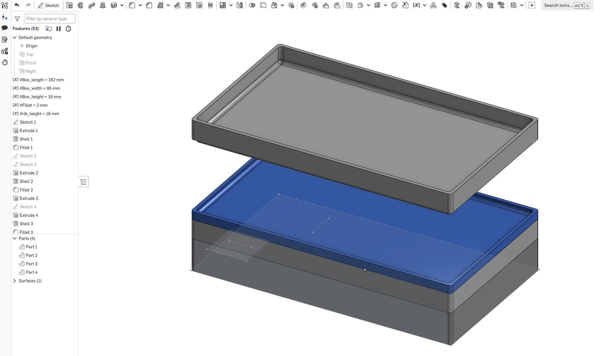 The first step was to find a computer-aided design software that I liked, could learn quickly and importantly, was either affordable, or preferably, free! I quickly homed in on Onshape which seemed to tick all the boxes, even the last one if you are happy for your creations to live in the public domain. The learning curve followed a gentle gradient, and after a couple of less ambitious excursions, one of which the design of a pair of VESA spacers for my son’s TV, I started working on some ideas for a set of stackable parts trays. After a couple of false starts, and adjustments to the dimensions, the final design came together. Here’s the overview with dimensions shown in the left-hand column. The height of each tray was defined by the intended contents, the deepest for casing parts, and the shallowest, the miscellaneous/lid.