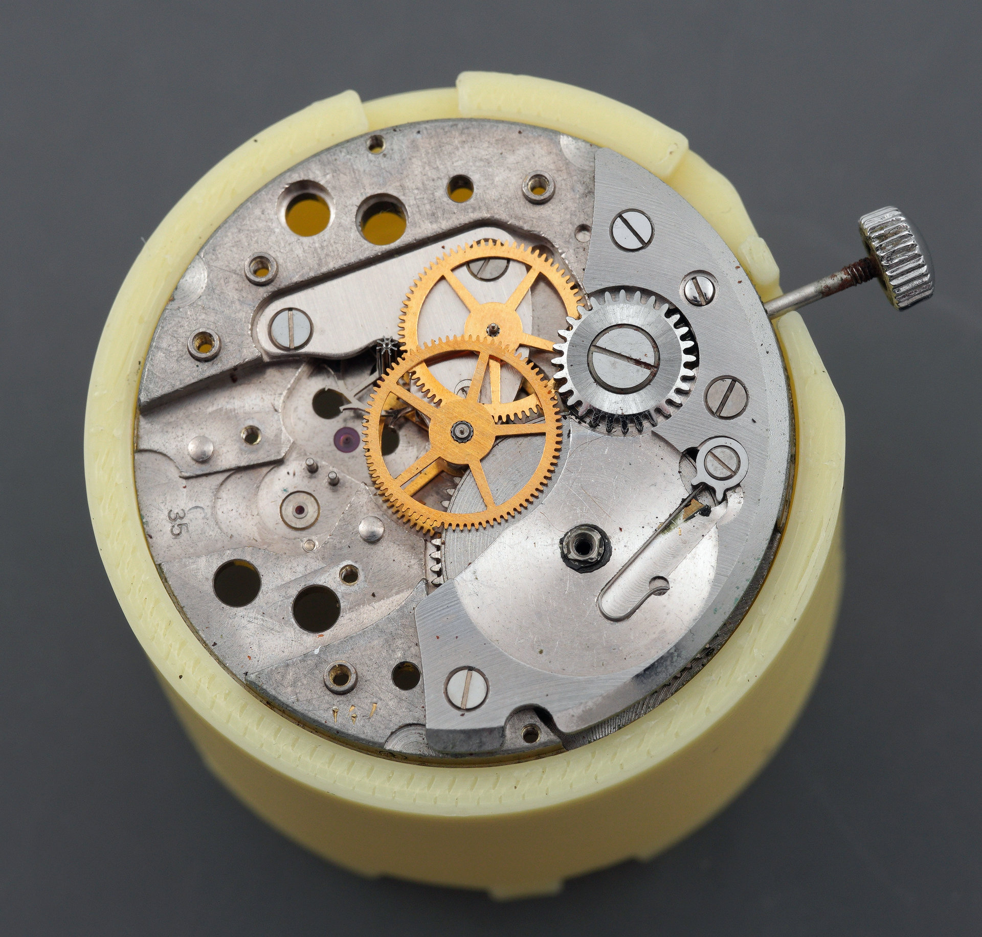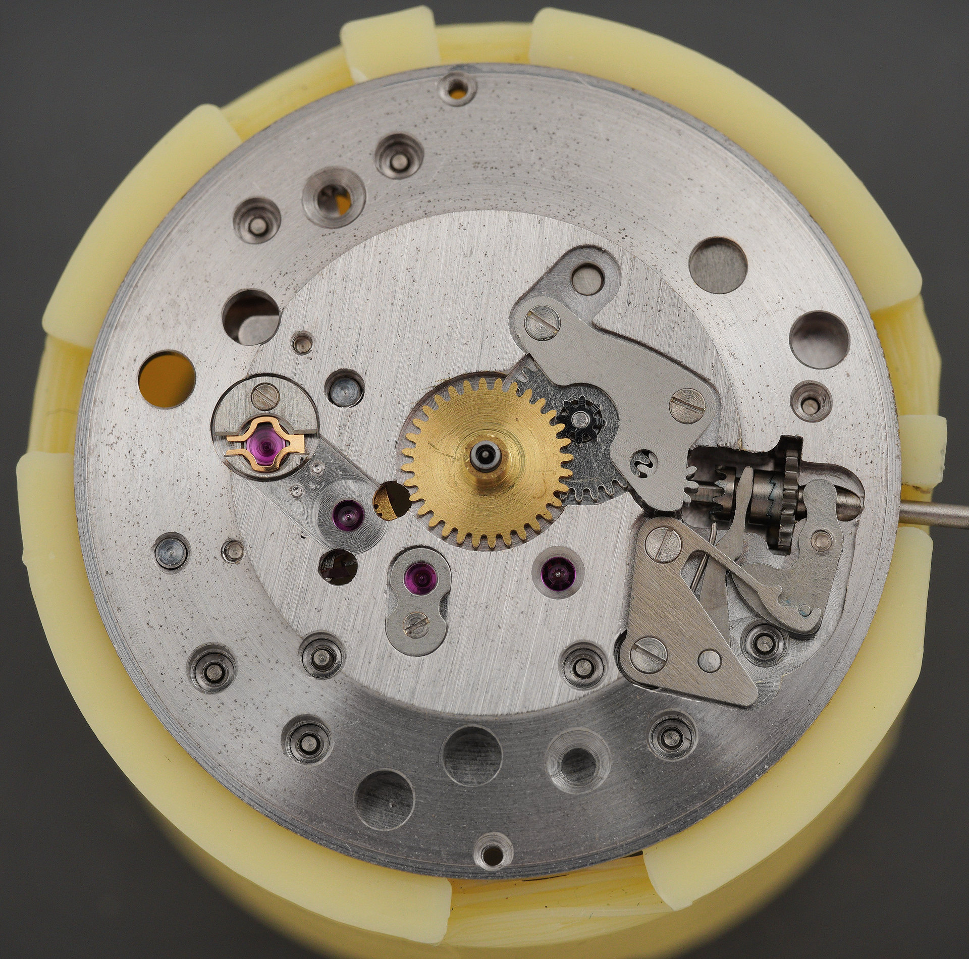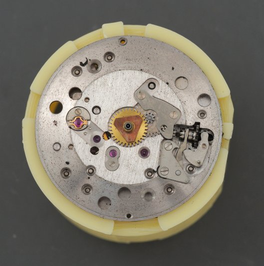 With the movement extracted from the case, the dial can be removed, exposing the dial side of the movement.