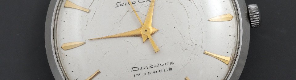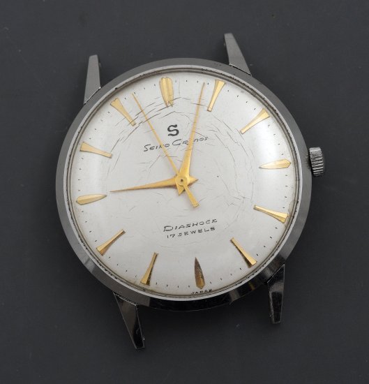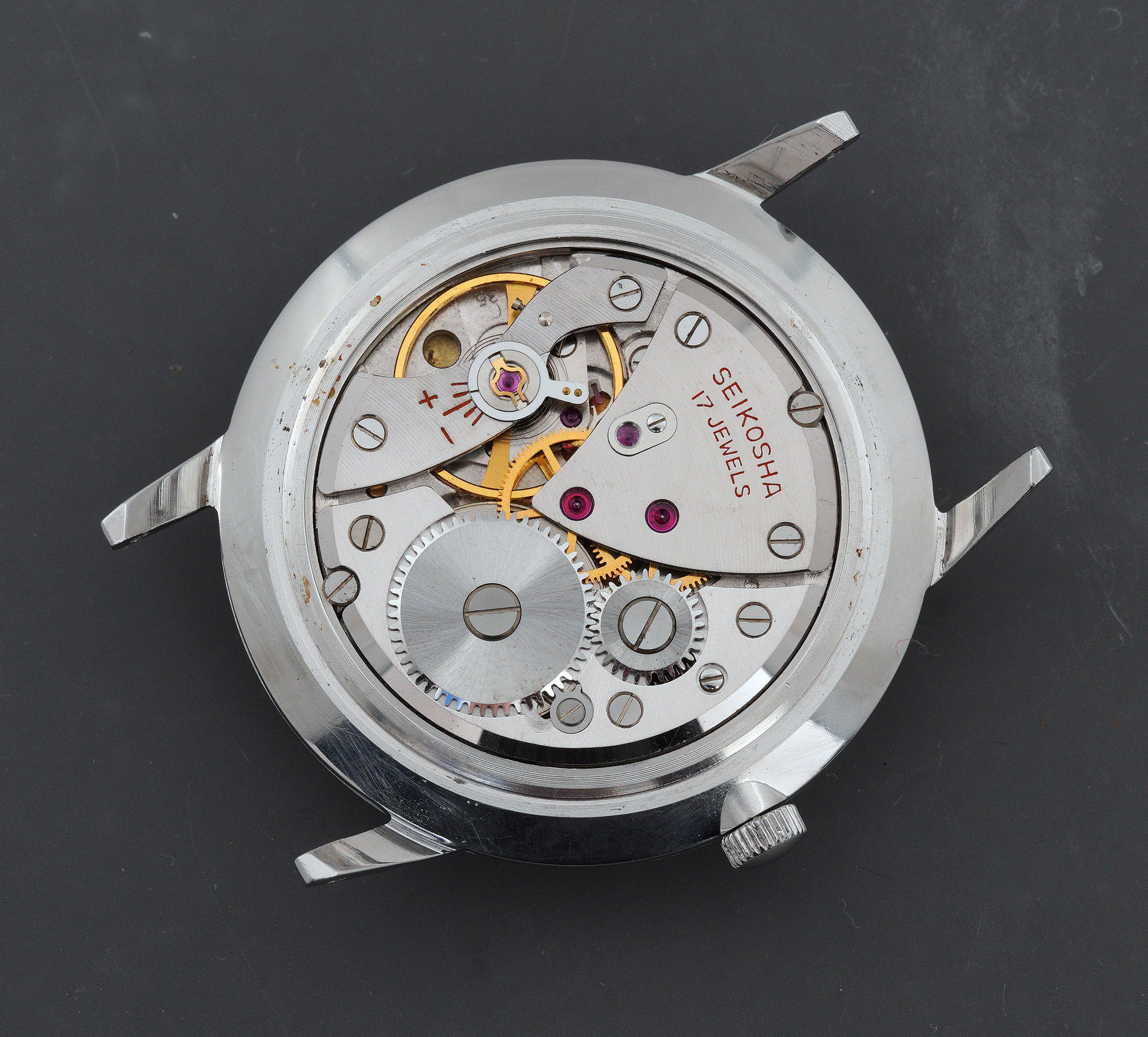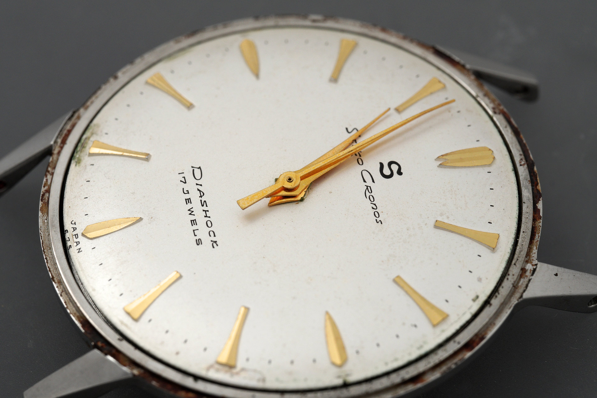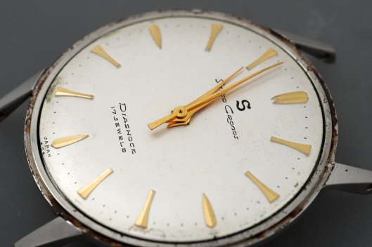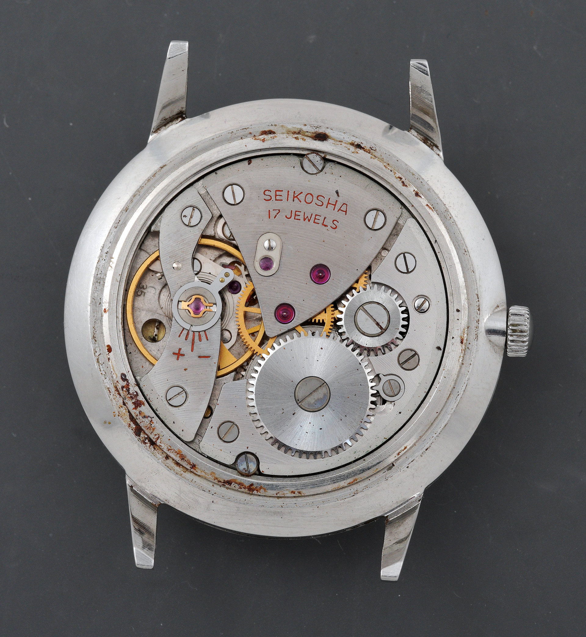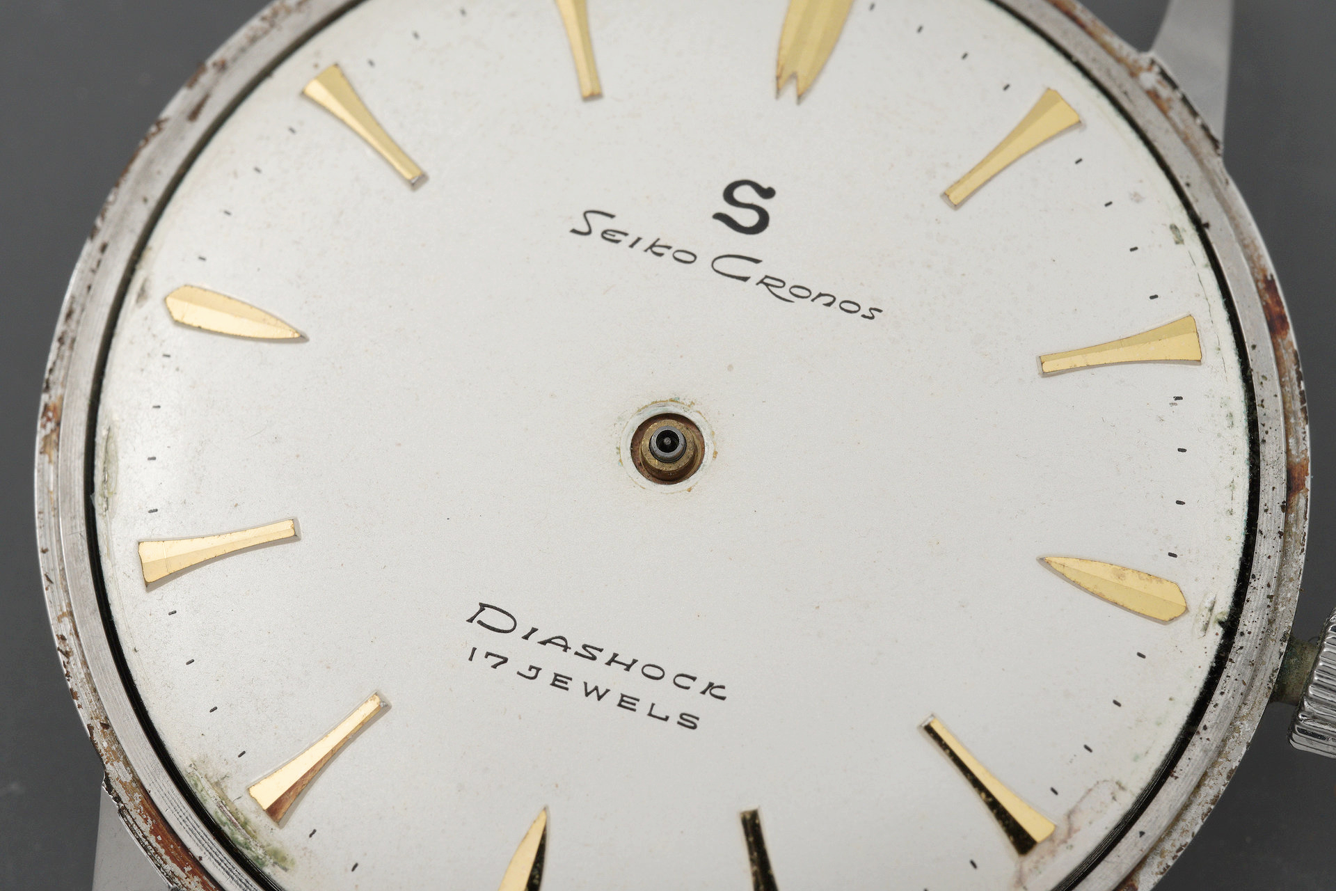 The pairing of a stainless steel case with a dial with gold accents was a common combination in late-1950s Seiko watches and so questions of either dial or case substitutions having occurred in the intervening 68 years can be dismissed. Externally, this watch presents very nicely indeed, aside from the crazing of the acrylic crystal. The case back interior, however, reveals evidence of water intrusion at some point.
