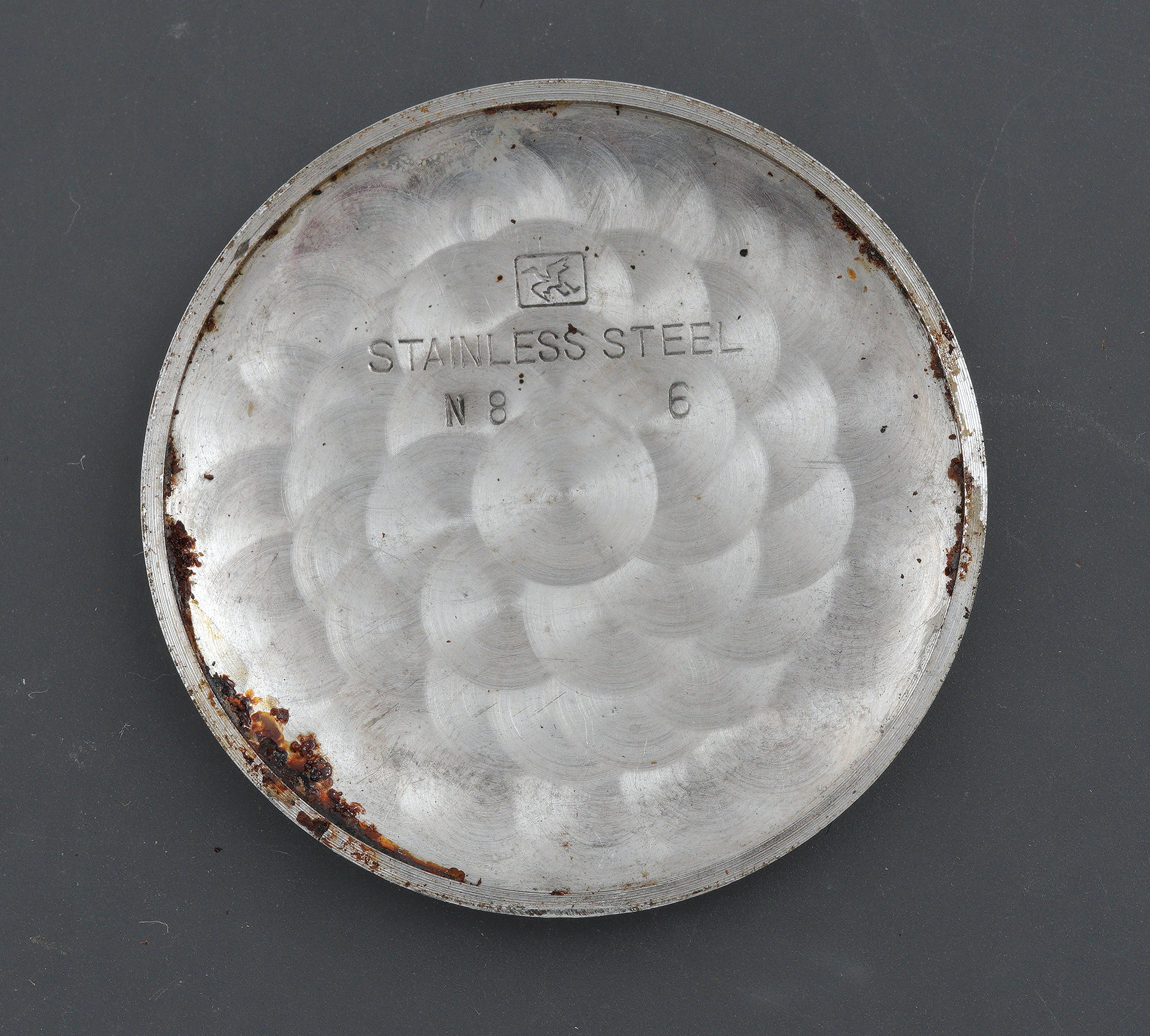 The imprinted crane symbol signifies that this watch is a product of Daini Seikosha factory in Tokyo. Notice also that in 1958, the month symbol in the serial number precedes the year, that order reversing within a year or two to the familiar dating system used by Seiko to the present day. The rust encircling the case back is duplicated in patches around the periphery of the mid-case.