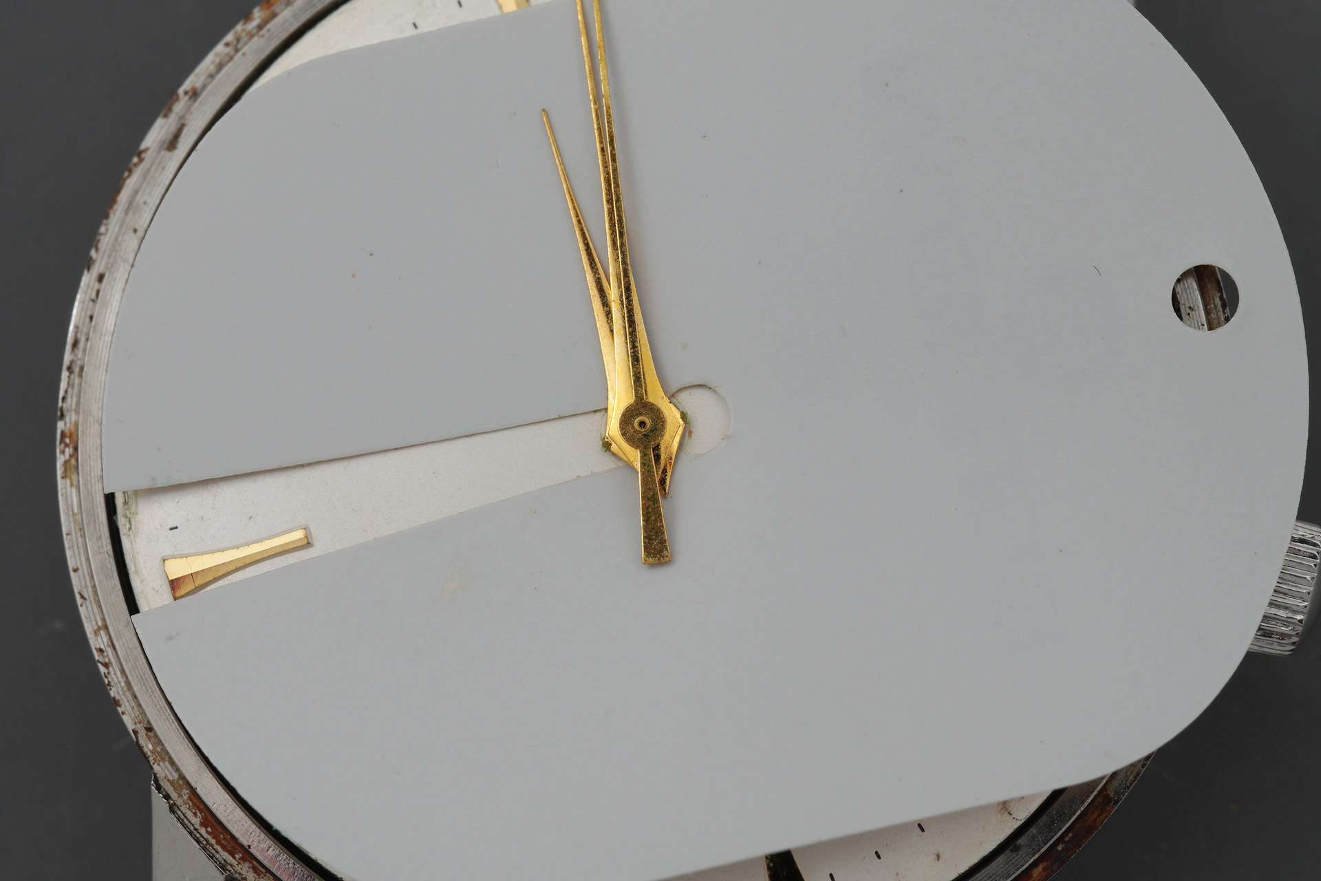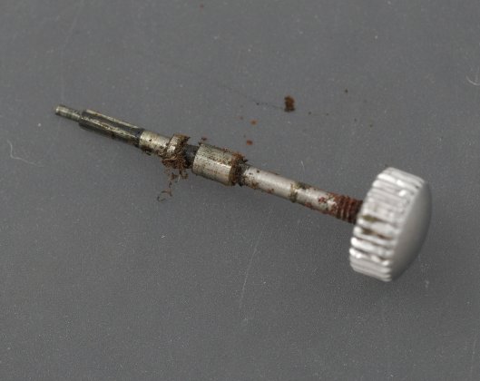 In order for the movement to be lifted away from the case, the movement retaining screws must be removed from the rear and the crown and stem extracted. The condition of the latter provides evidence of a second route for water to have made its way into the case.