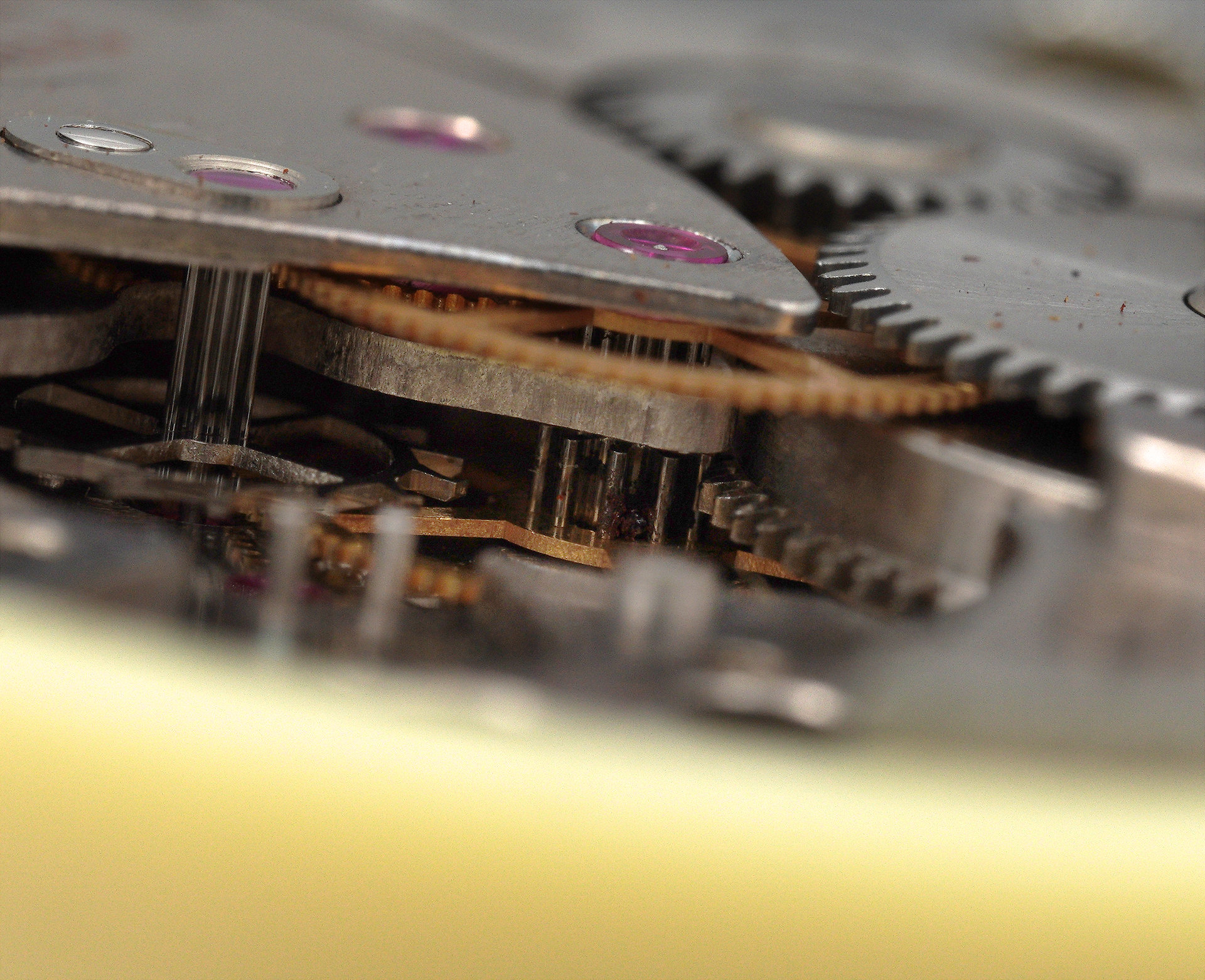 Following cleaning, the movement reassembly begins. Here we are with the setting components partially assembled, and with the gear train fully assembled but awaiting the escapement.
