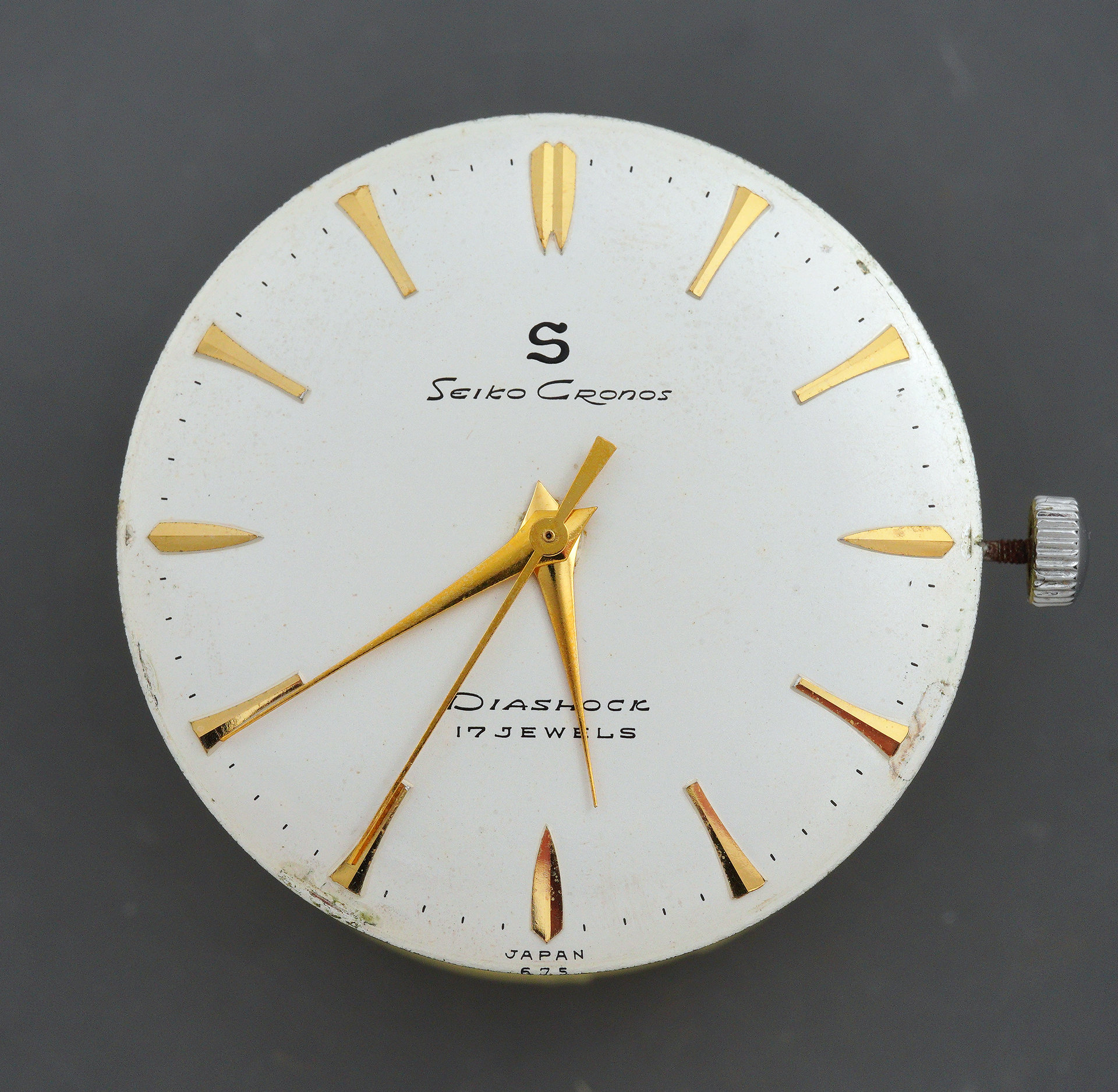 The most obvious and seemingly ubiquitous Cronos gremlin in evidence here is the broken setting lever spring. This is a failure that I’ve encountered in several other Cronos and early King Seiko movements, a vulnerability likely caused by the stresses of too many turns of the setting lever screw during previous stem removals. Those of you familiar with this family of movements will notice too that the design of the setting lever spring is different to that of later examples of the Cronos and its relations in that it does not have the second arm extending to protect the winding pinion. When seeing a fracture such as this, one might reasonably speculate about the location of the partner fragment. In this case, I located it adhered to the rear of the dial.