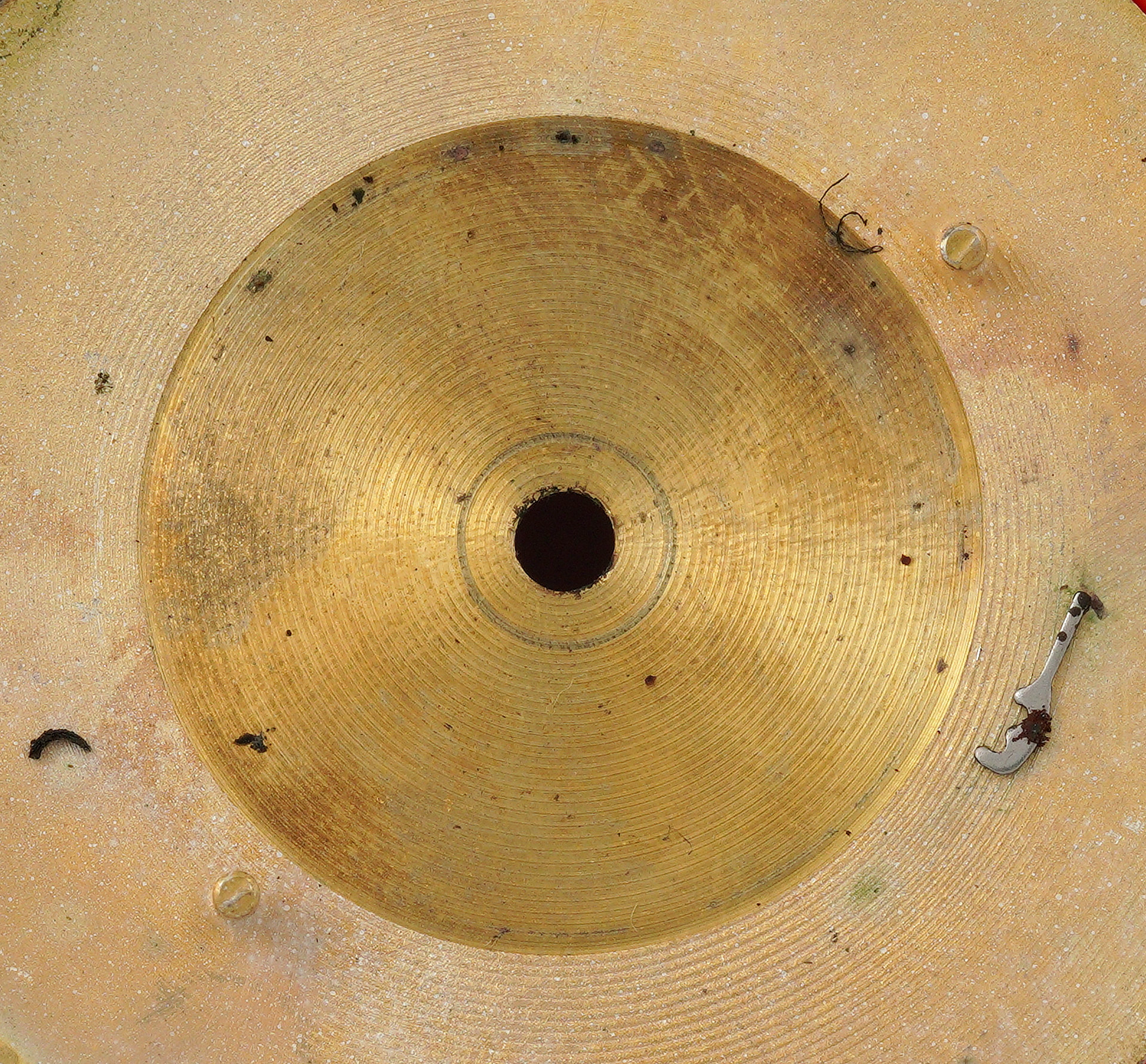 When I received this watch, it was not running and failed to respond to any encouragement to do so. As I was dismantling the movement, the cause of this became clear. The centre wheel pinion had become gummed up with fragments of corrosion, preventing the wheel from turning and leaving all that pent-up frustrated potential energy contained in the mainspring.